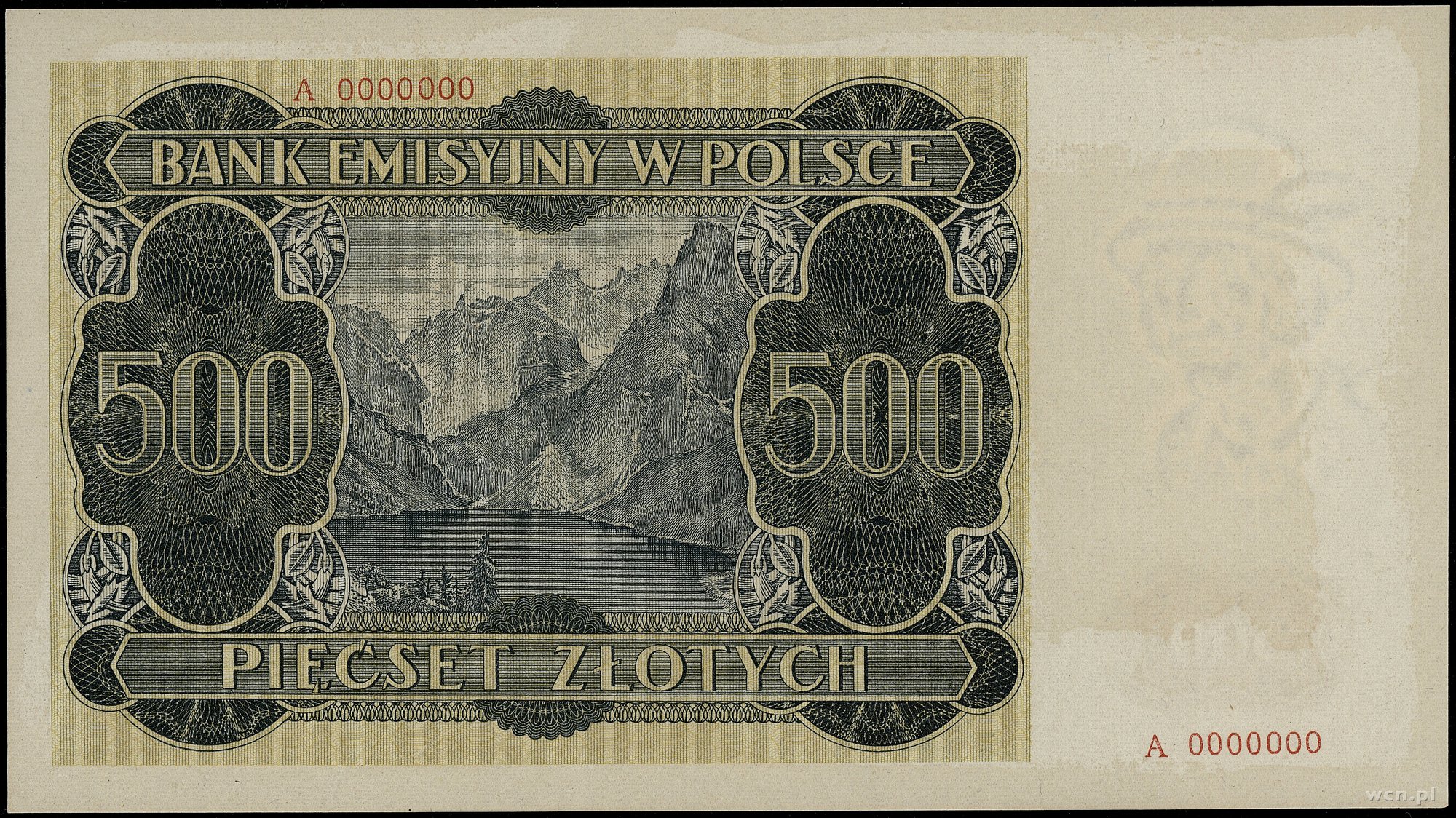 500 złotych, 1.03.1940; seria A, numeracja 0000000, bez perforacji i bez nadruków WZÓR; Lucow 800 (R6), Miłczak 98Wa; papier odświeżony, rzadki typ banknotu.