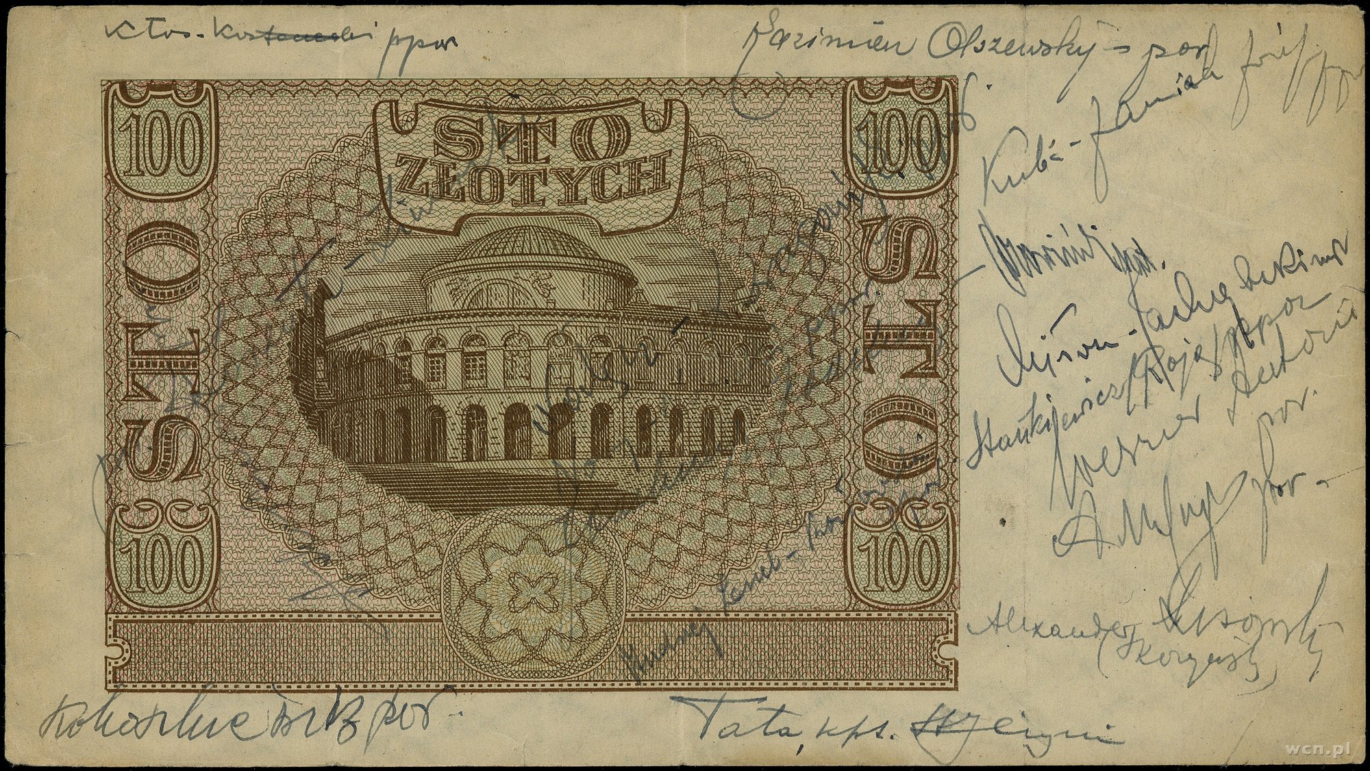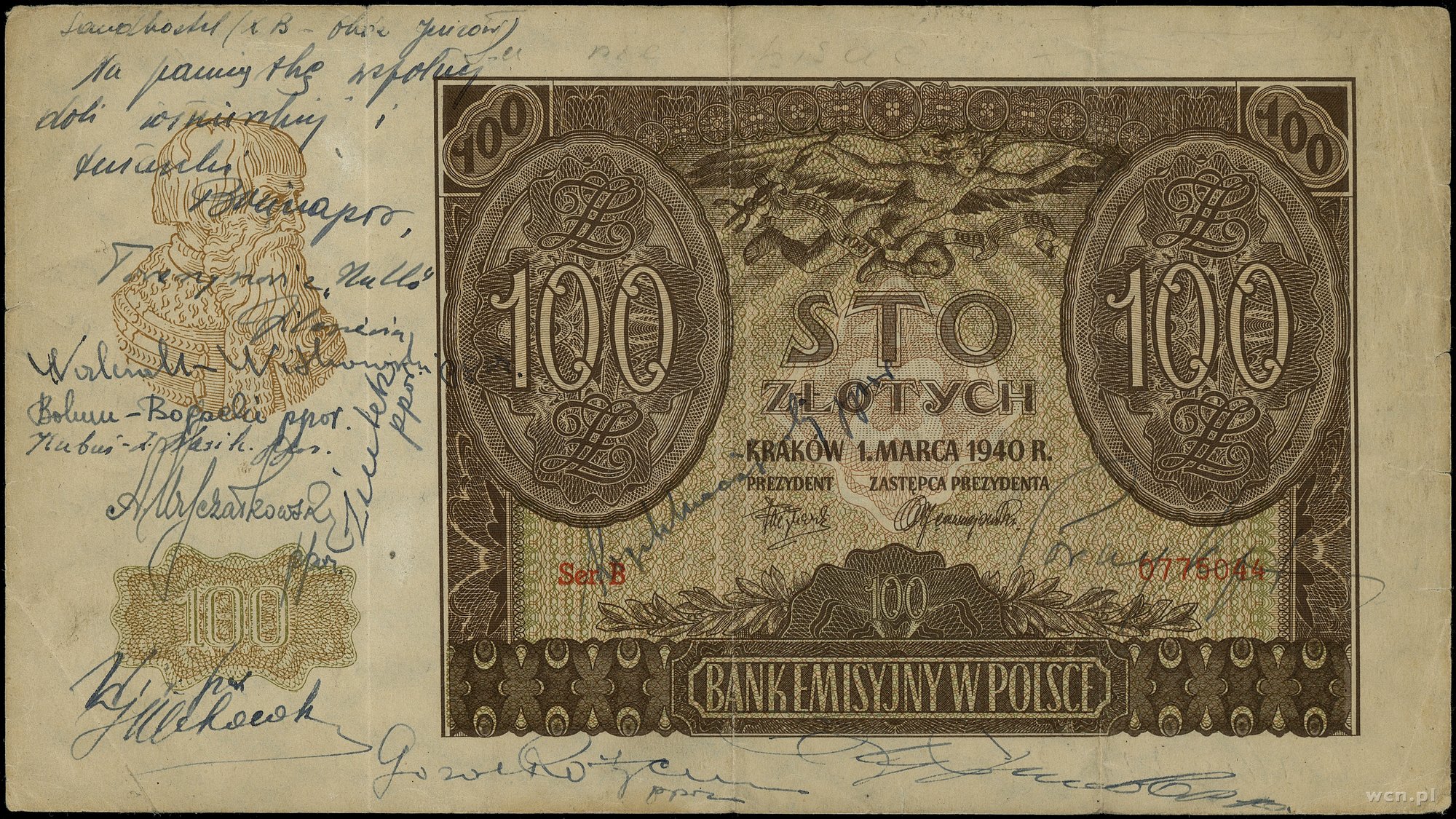 100 złotych, 1.03.1940; seria B, numeracja 0775044, fałszerstwo Związku Walki Zbrojnej z podpisami powstańców umieszczonych w obozie jenieckim Sandbostel, dodatkowo d..
