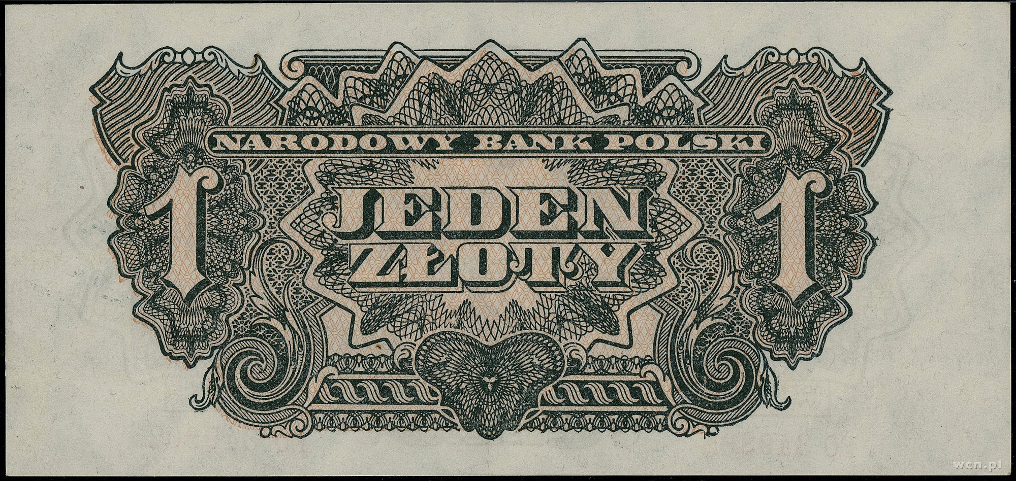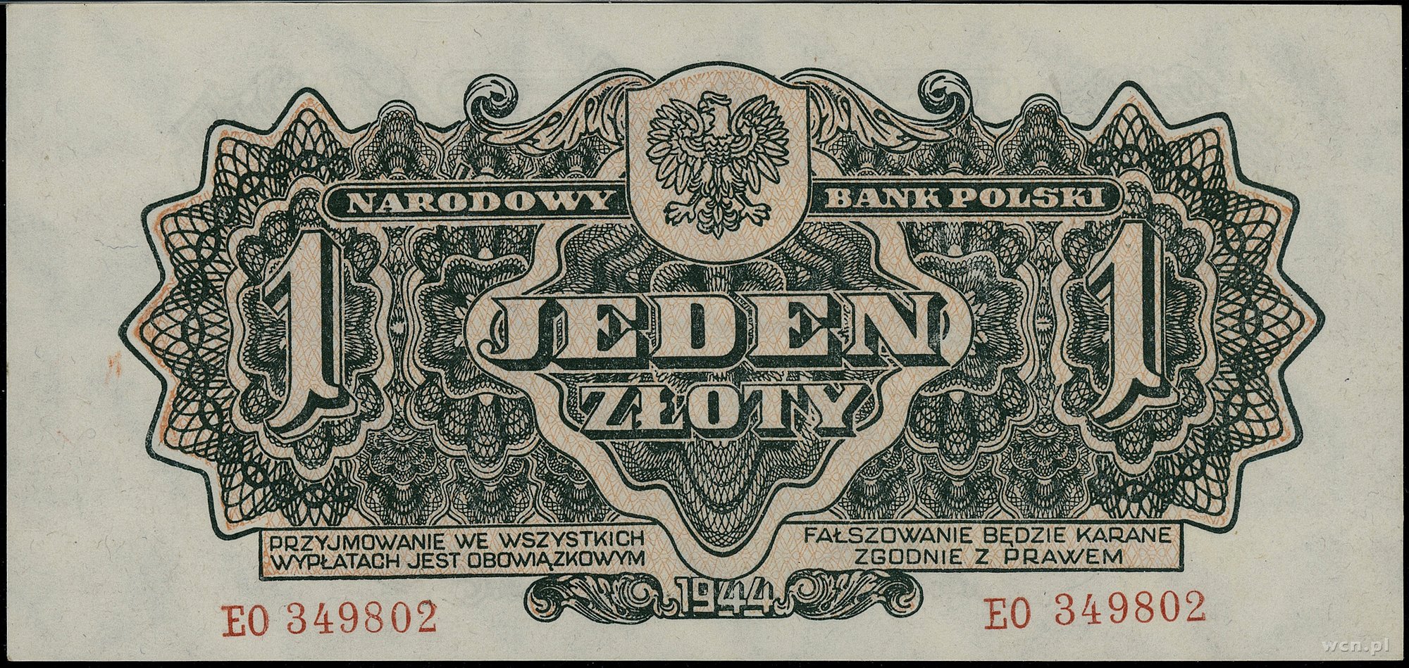 1 złoty, 1944; w klauzuli OBOWIĄZKOWYM, seria EO, numeracja 349802; Gucwa G1, Lucow 1077 (R2), Miłczak 105a; wyśmienity banknot w opakowaniu PMG 2201700-064 z oceną G..