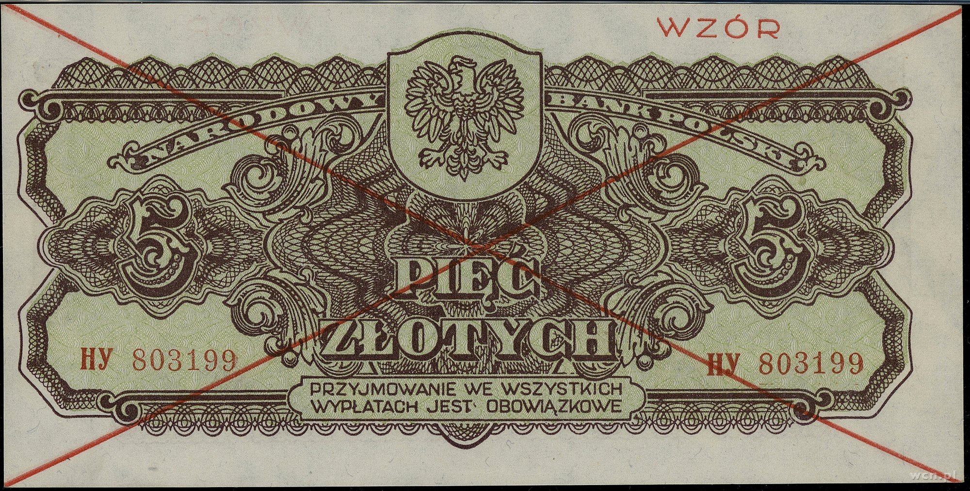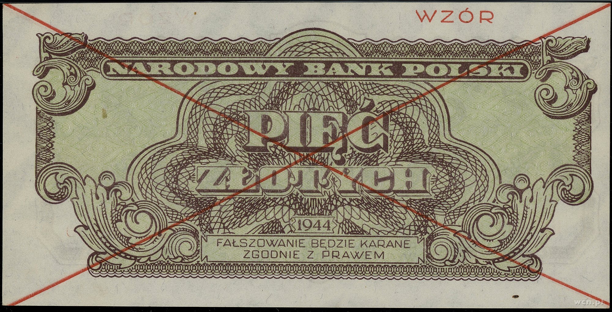 5 złotych, 1944; w klauzuli OBOWIĄZKOWYM, seria HY, numeracja 803199, dwukrotne czerwone skreślenie i poziomy napis WZÓR po obu stronach banknotu; Lucow 1106a (R4), M..