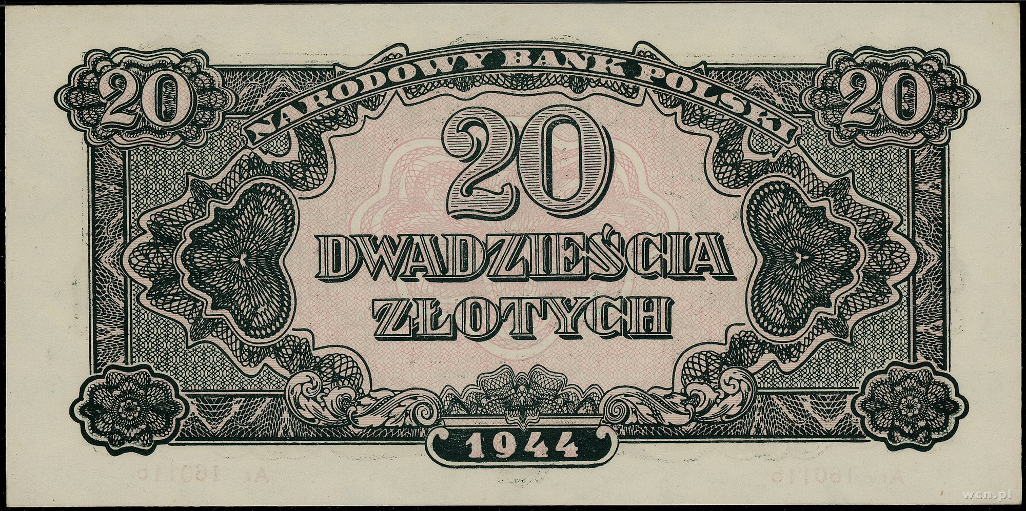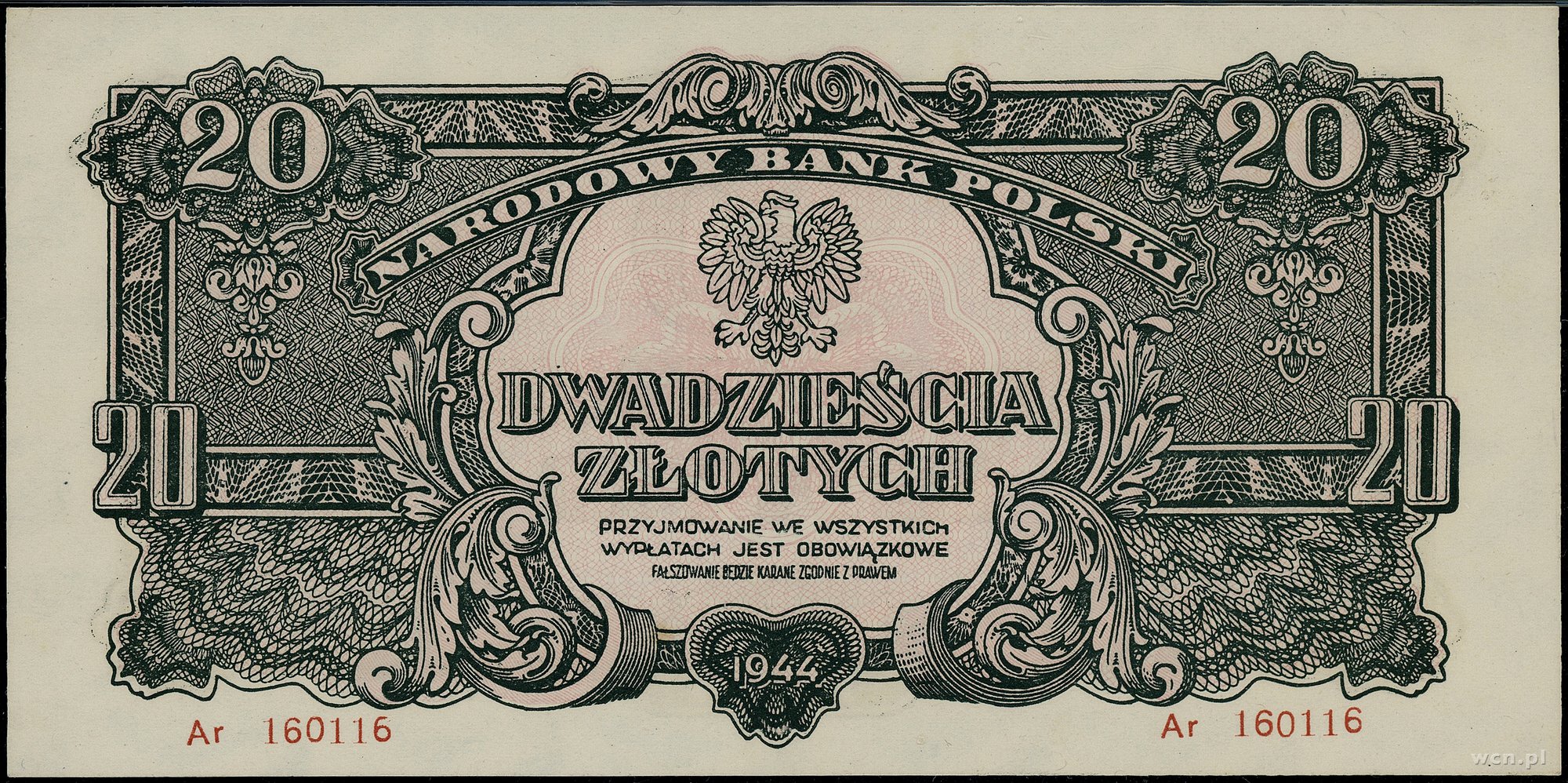 20 złotych, 1944; w klauzuli OBOWIĄZKOWE, seria Ar, numeracja 160116; Lucow 1122 (R2), Miłczak 116c, Gucwa G2; wyśmienity banknot w opakowaniu PMG 2202936-047 z oceną..
