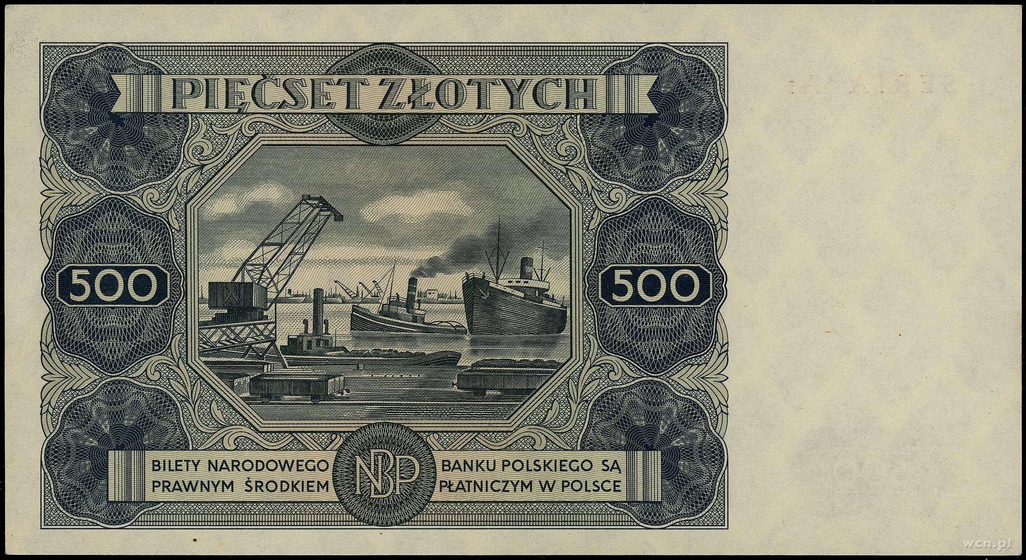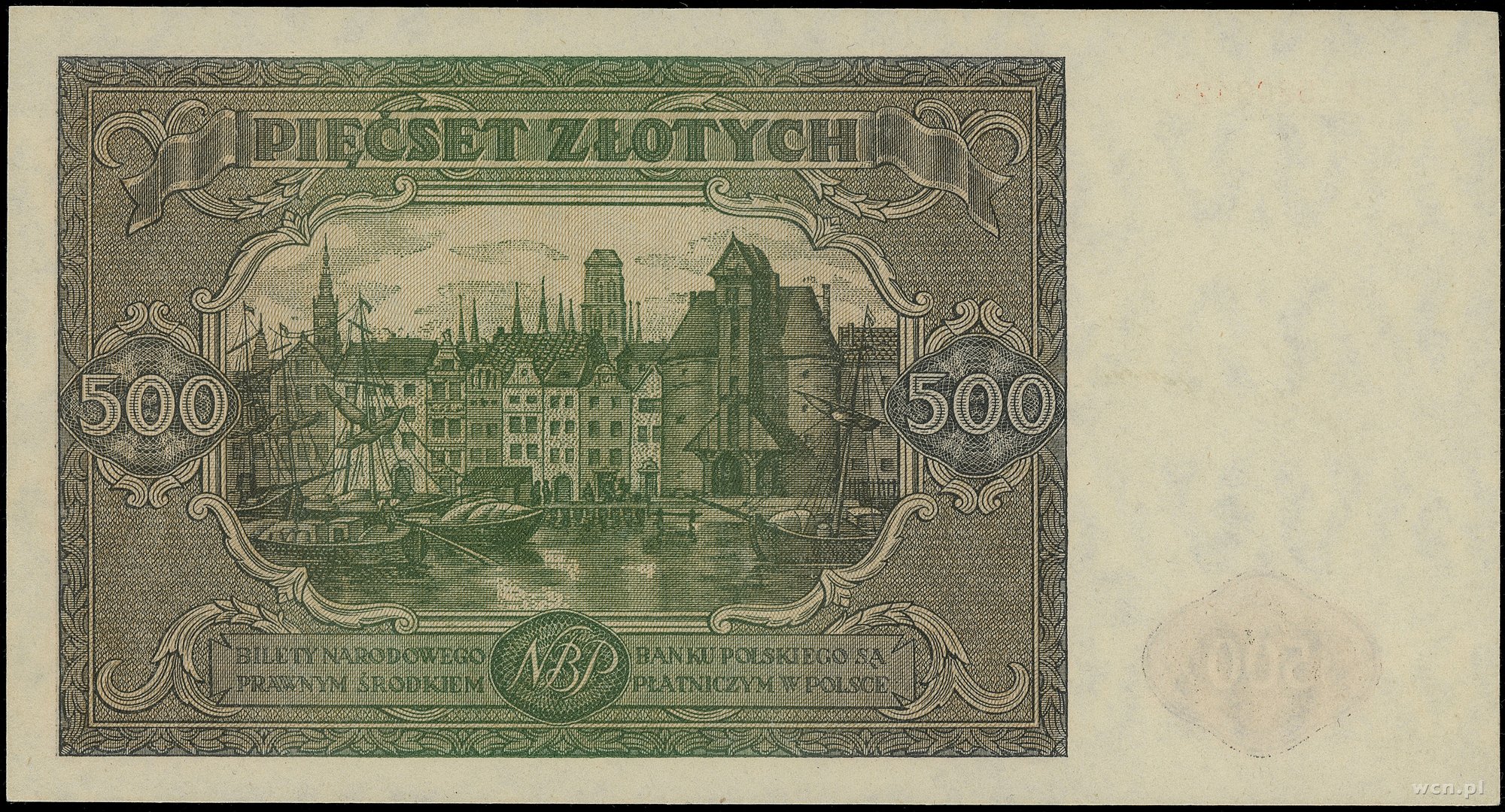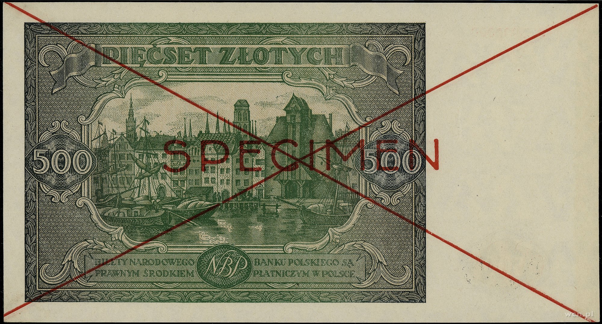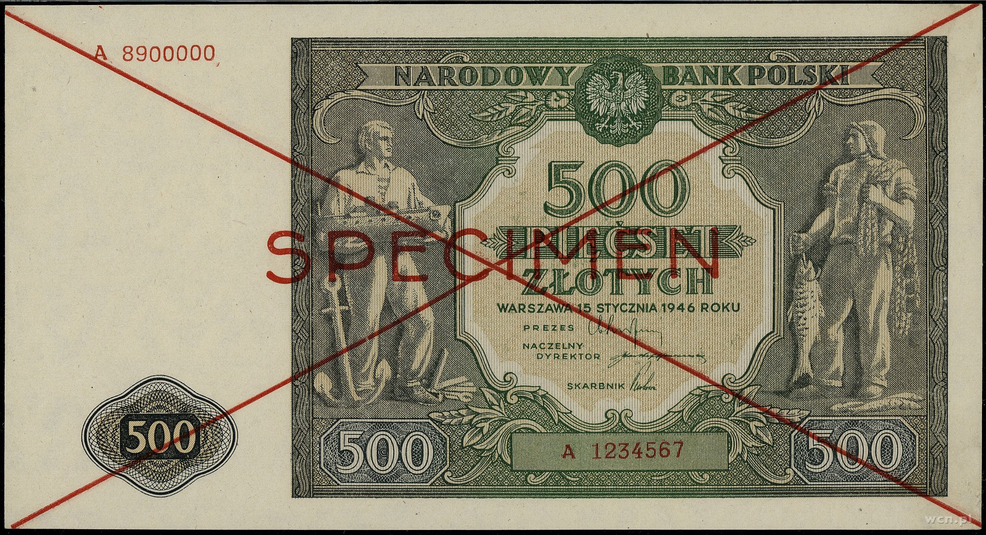 500 złotych, 15.01.1946; seria A, numeracja 8900000 / 1234567, czerwone dwukrotne przekreślenie i poziomo SPECIMEN po obu stronach banknotu; Lucow 1153 (R6), Miłczak ..