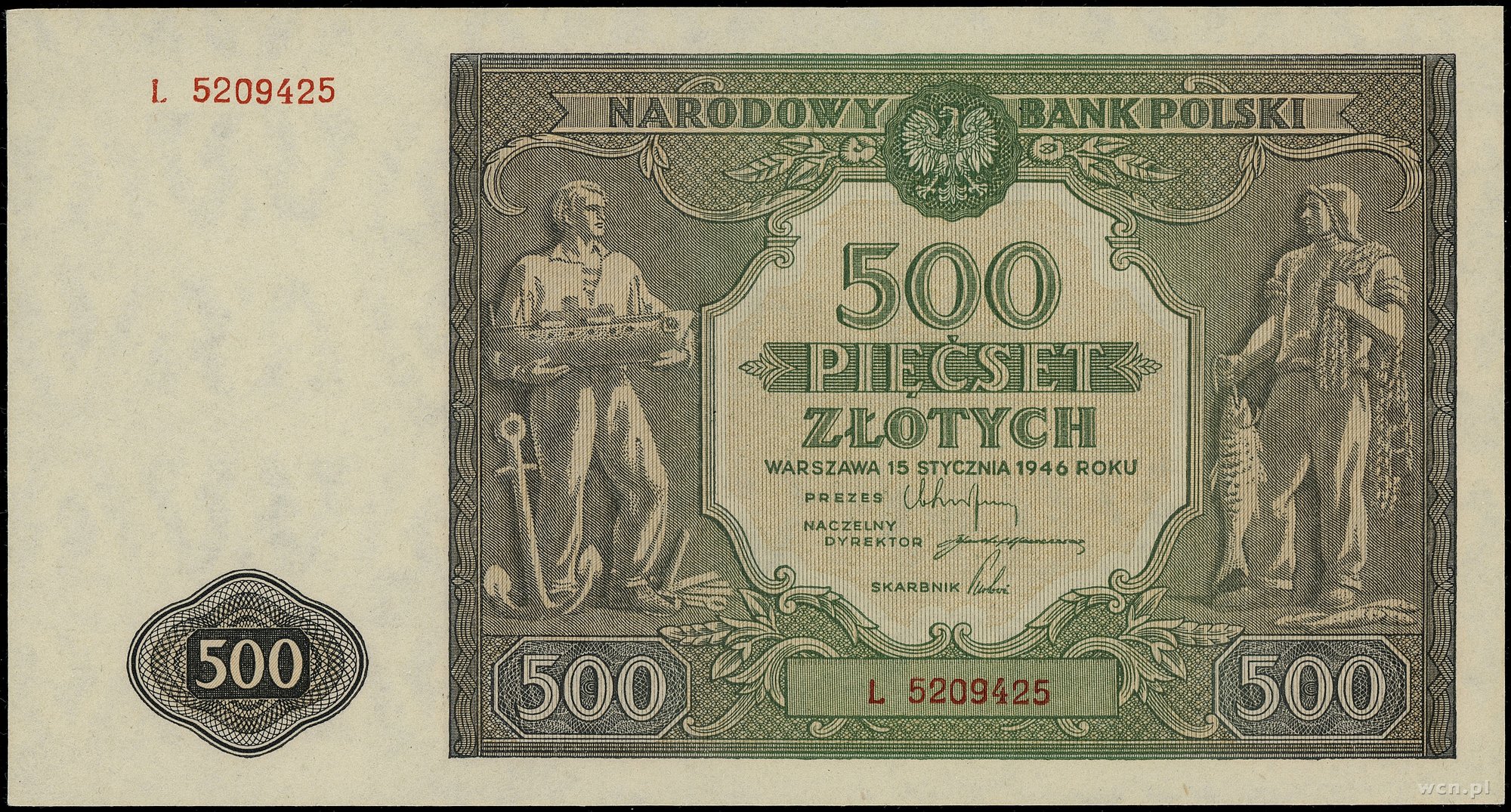 500 złotych, 15.01.1946; seria L, numeracja 5209425; Gucwa G3, Lucow 1159 (R4), Miłczak 121a; minimalnie nieświeże górne rogi, pięknej prezencji banknot.