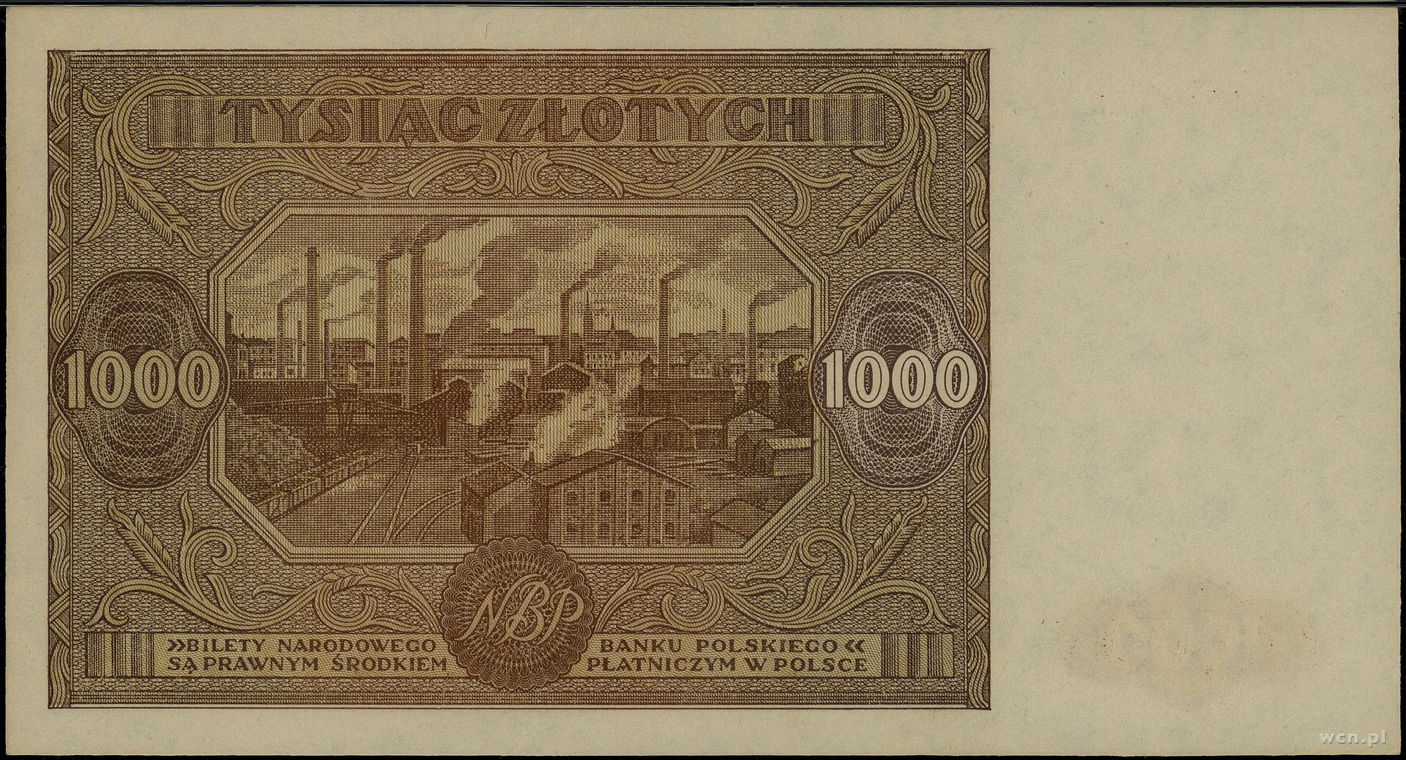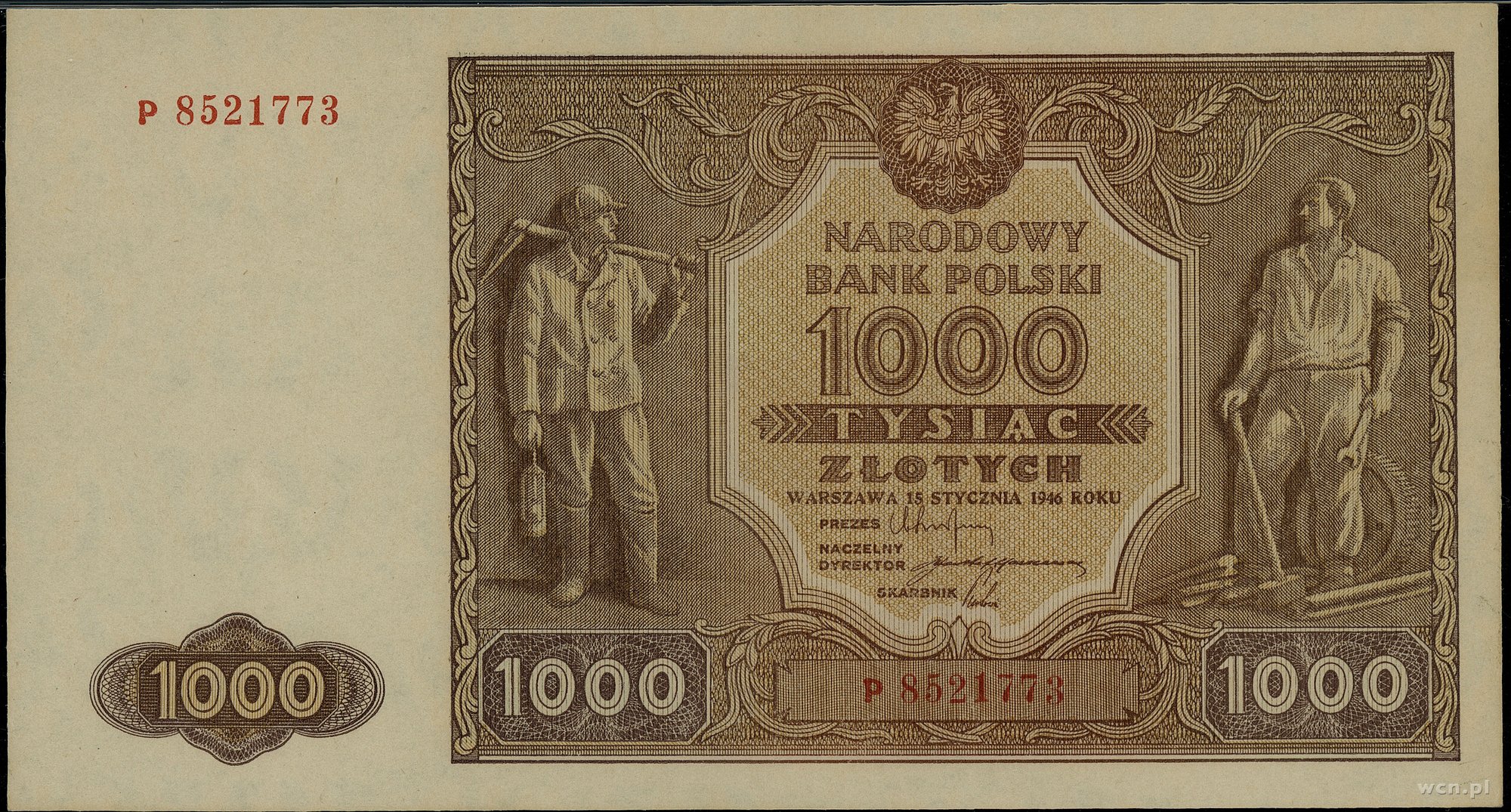 1.000 złotych, 15.01.1946; seria P, numeracja 8521773; Gucwa G2, Lucow 1171 (R4), Miłczak 122a; wyśmienity banknot w opakowaniu PMG 6012138-010 z oceną Gem Uncirculat..