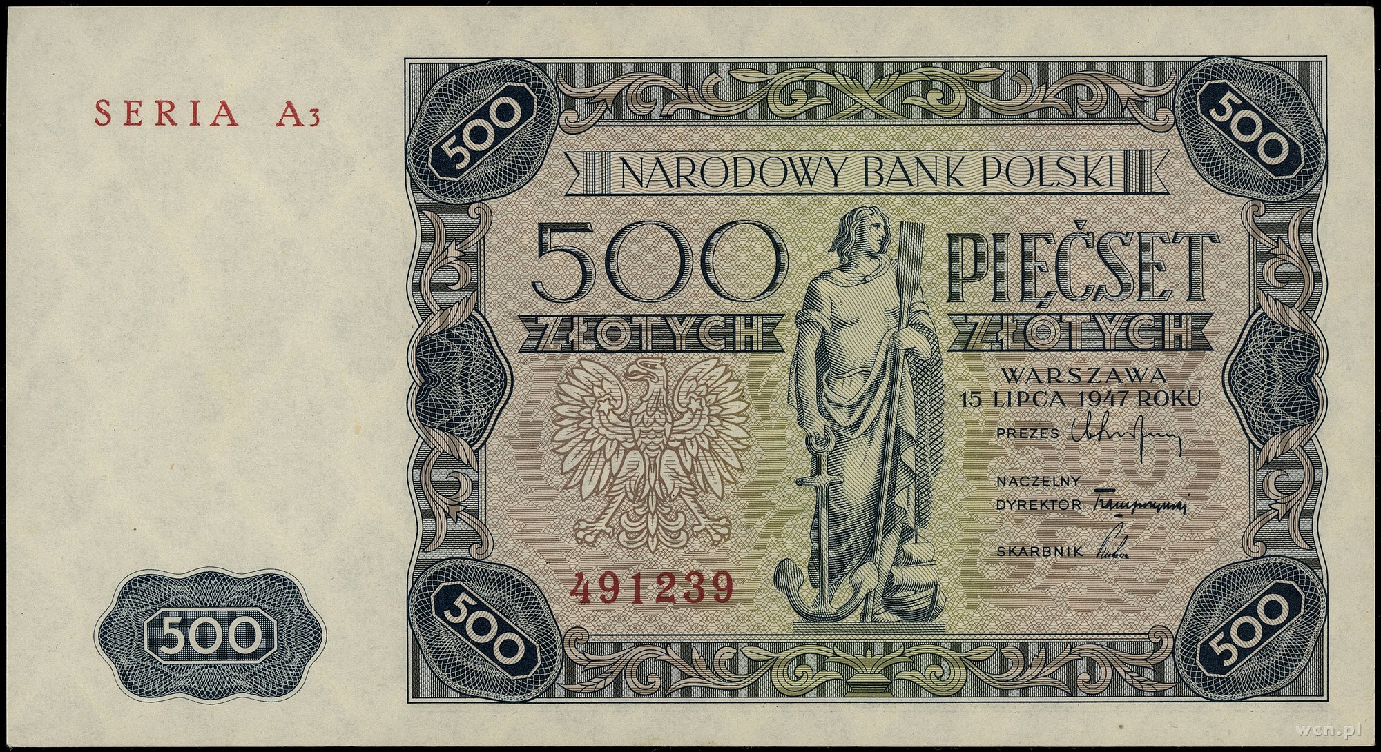 500 złotych, 15.07.1947; seria A3, numeracja 491239; Gucwa G6, Lucow 1230a (R5), Miłczak 132c; minimalnie nieświeże prawe rogi banknotu, bardzo rzadkie w tak pięknym ..