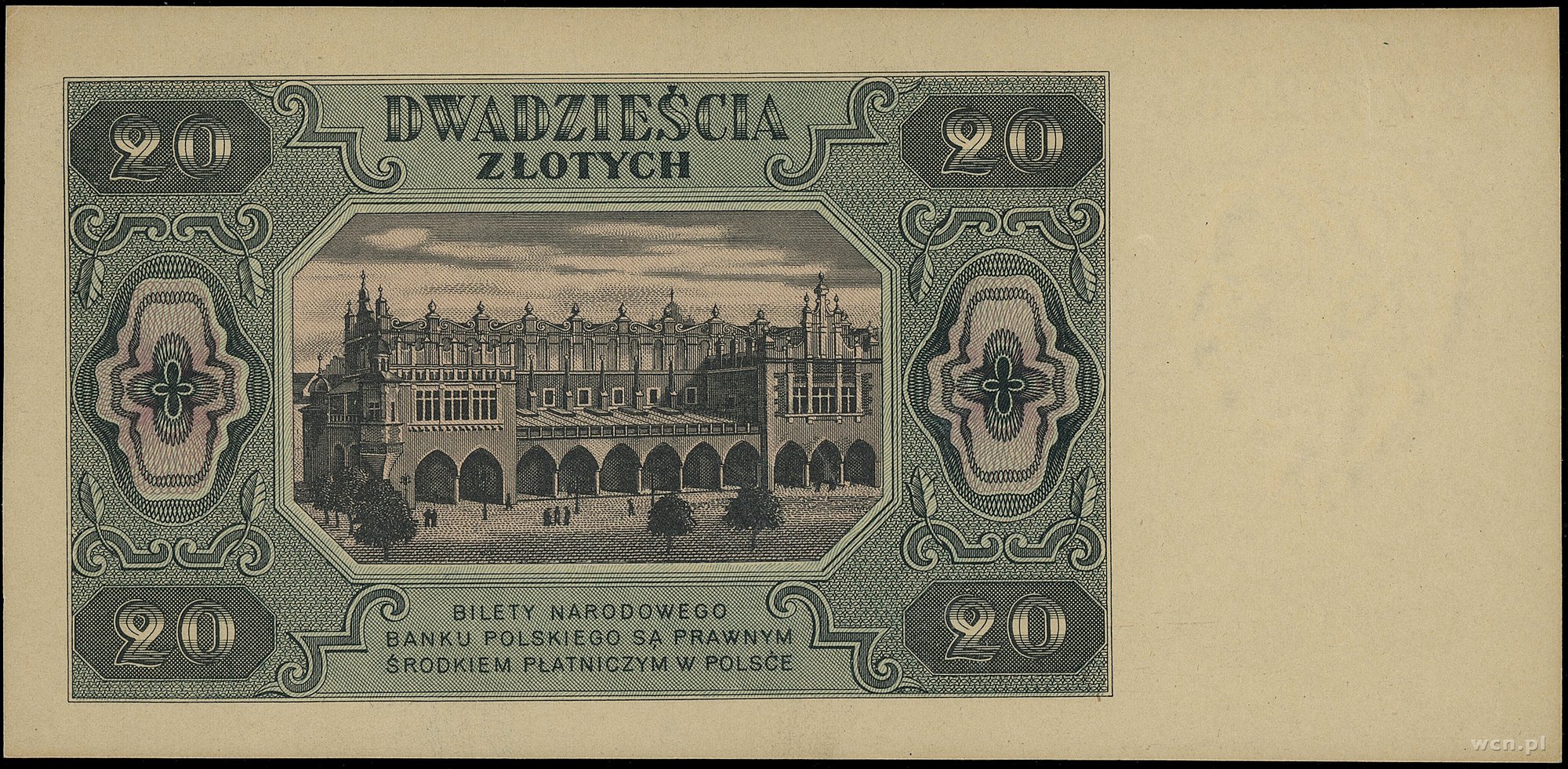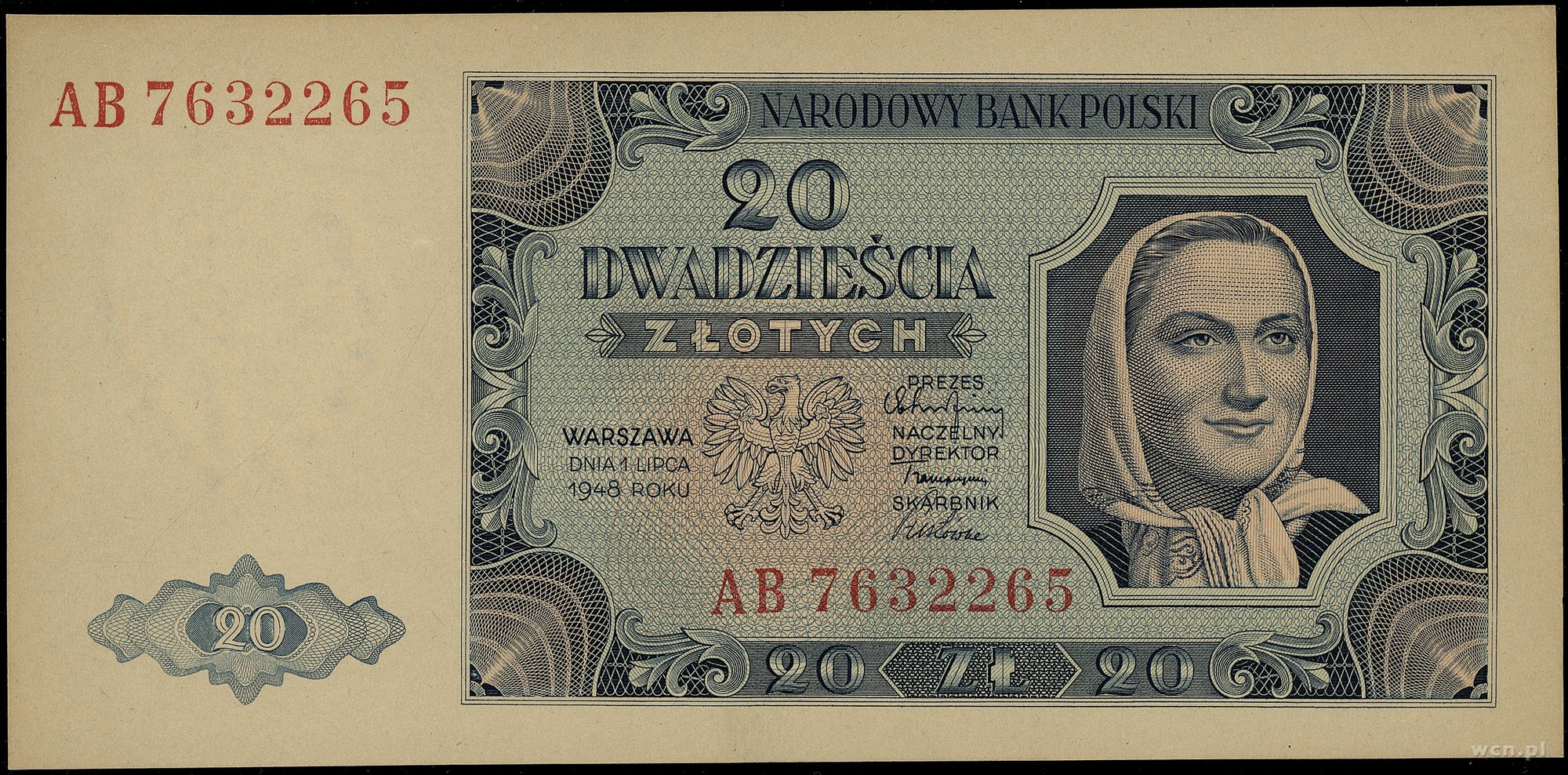 20 złotych, 1.07.1948; seria AB, numeracja 7632265; Gucwa G5, Lucow 1268 (R3), Miłczak 137b; ugięcie na górnym marginesie, miejscowe nieświeżości papieru, ale pięknej..