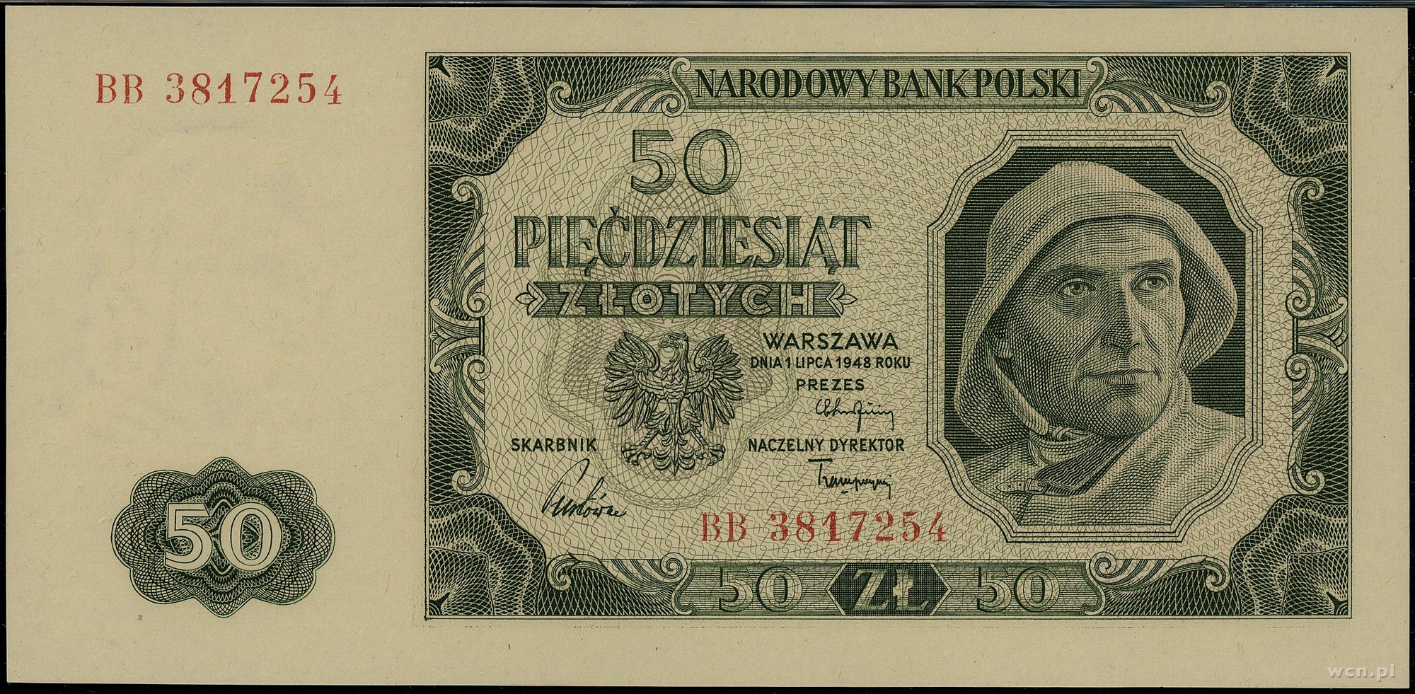 50 złotych, 1.07.1948; seria BB, numeracja 3817254; Gucwa G3, Lucow 1285 (R2), Miłczak 138e; pięknej prezencji banknot w opakowaniu PMG 2201700-099 z oceną Choice Unc..