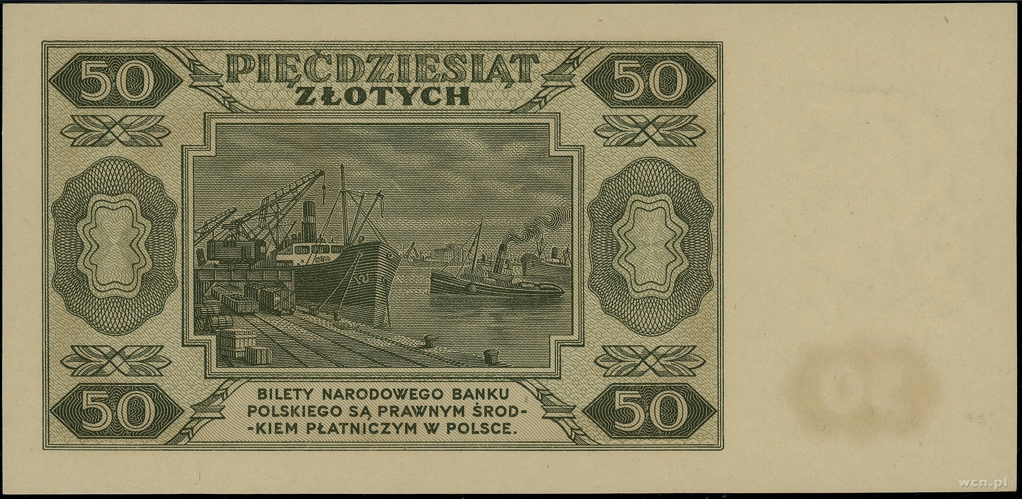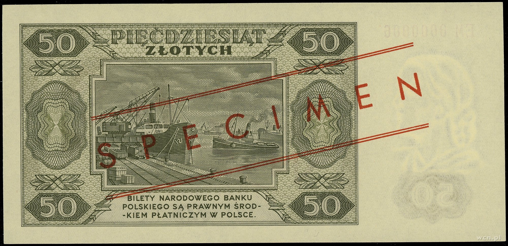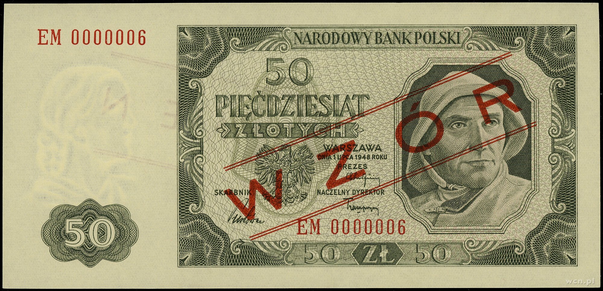50 złotych, 1.07.1948; seria EM, numeracja 0000006, czerwone ukośne WZÓR / SPECIMEN (wzór Jaroszewicza) – bardzo ciekawy i rzadki typ z nadrukami analogicznymi do nad..