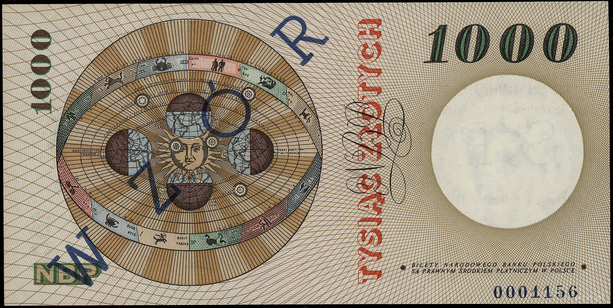 1.000 złotych, 29.10.1965; z nadrukiem wystawy numizmatycznej NBP, seria G, numeracja 0000000, na stronie głównej fioletowy poziomy nadruk SPECIMEN, na stronie odwrot..
