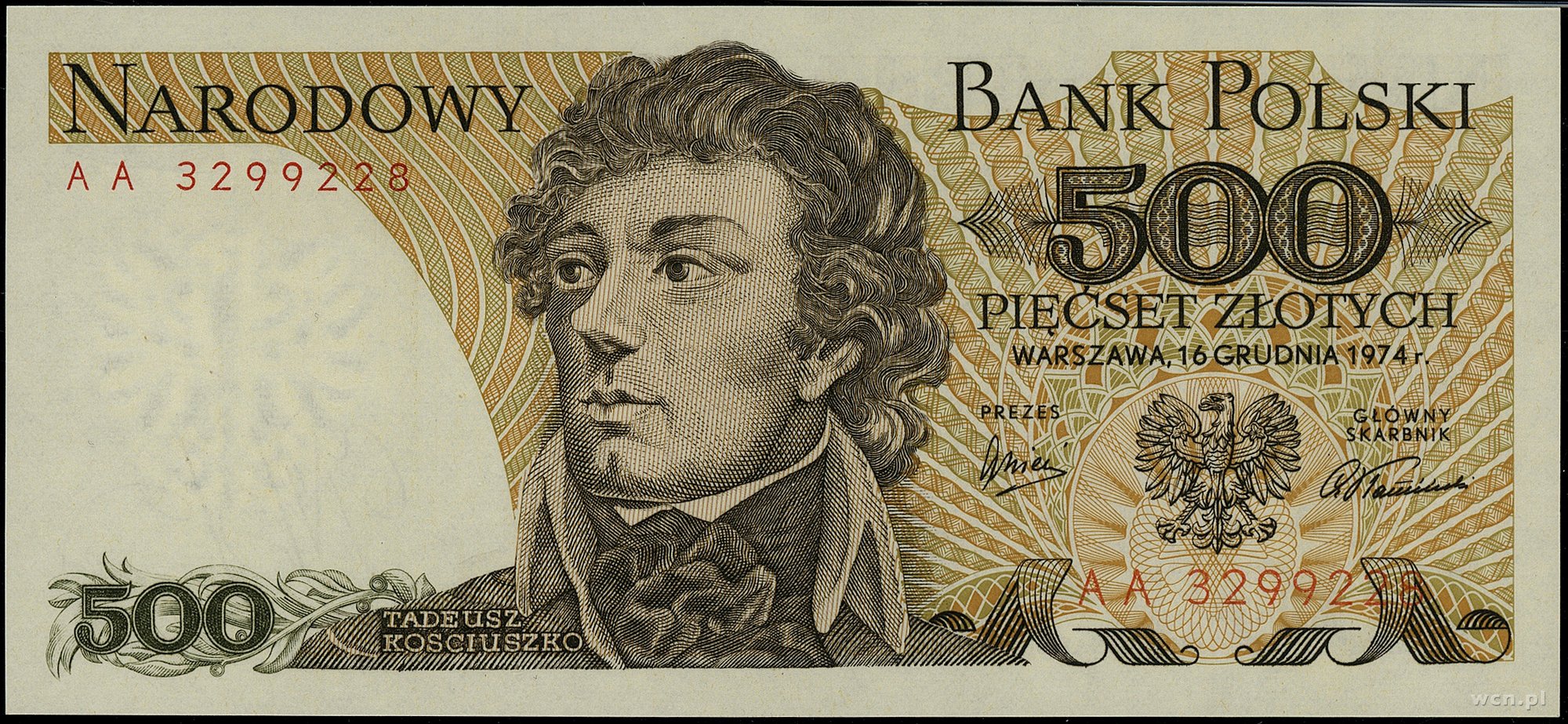 500 złotych, 16.12.1974; początkowa seria AA, numeracja 3299228; Lucow 1443 (R3), Miłczak 142b, Szparło L5; wyśmienicie zachowany banknot w opakowaniu PMG 2202948-035..