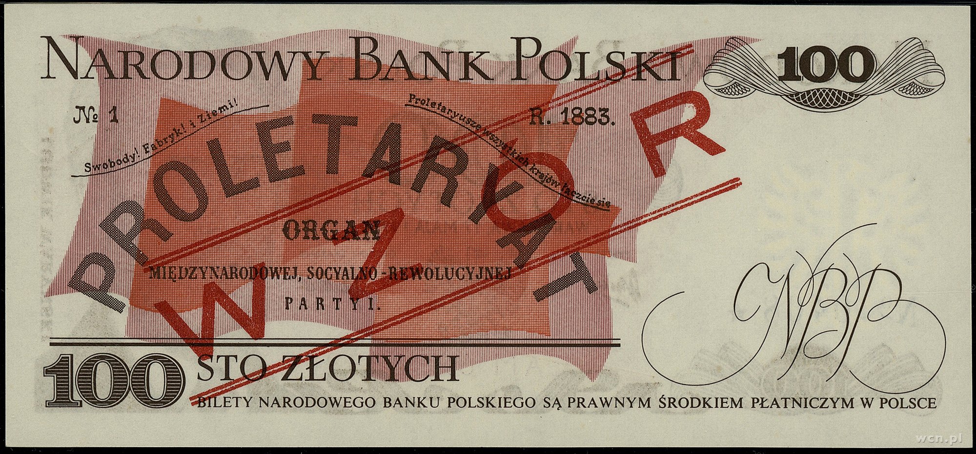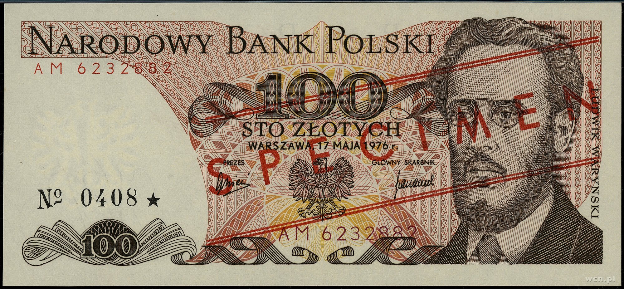 100 złotych, 17.05.1976; seria AM, numeracja 6232882, czerwony nadruk SPECIMEN/WZÓR, dodatkowa numeracja 0408*; Lucow 1402 (R3), Miłczak 146Wb; wyśmienity banknot w o..