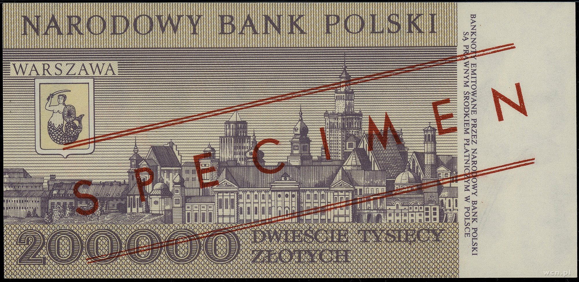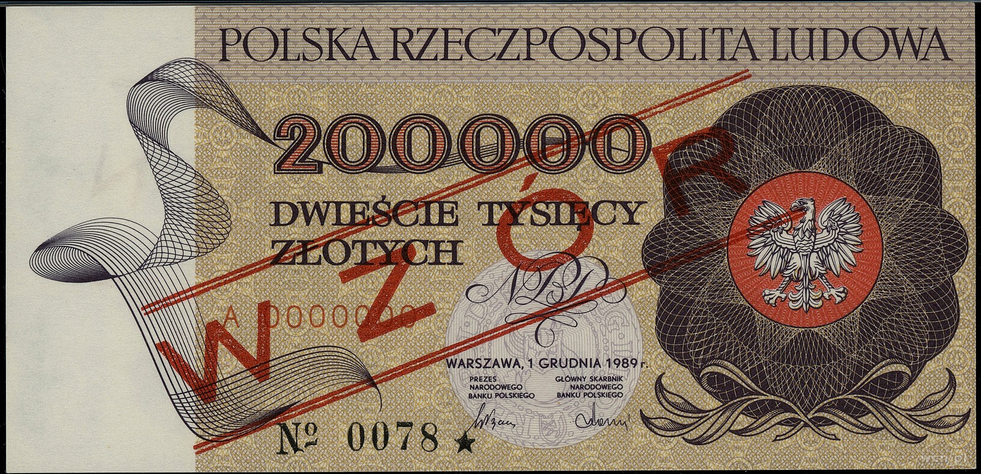 200.000 złotych, 1.12.1989; seria A, numeracja 0000000, czerwone ukośne WZÓR/SPECIMEN, dodatkowa numeracja wzoru 0078*; Lucow 1517 (R5), Miłczak 177Wa; wyśmienity egz..