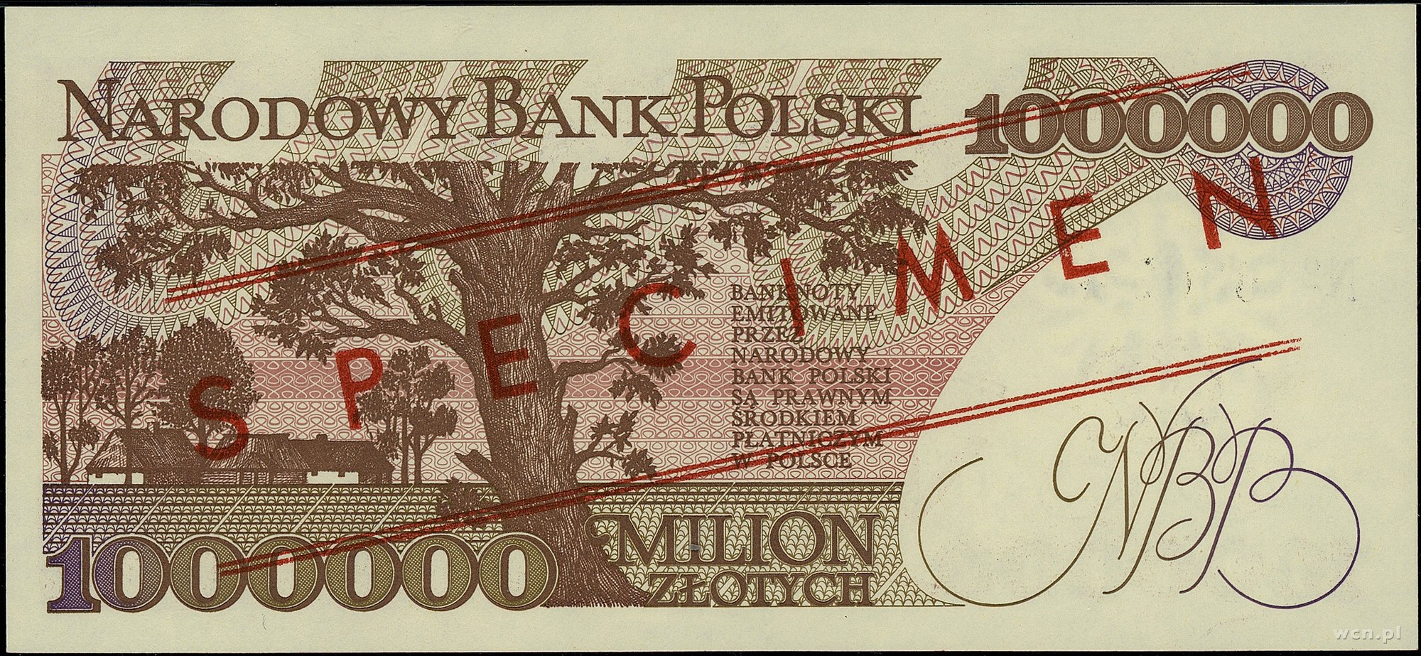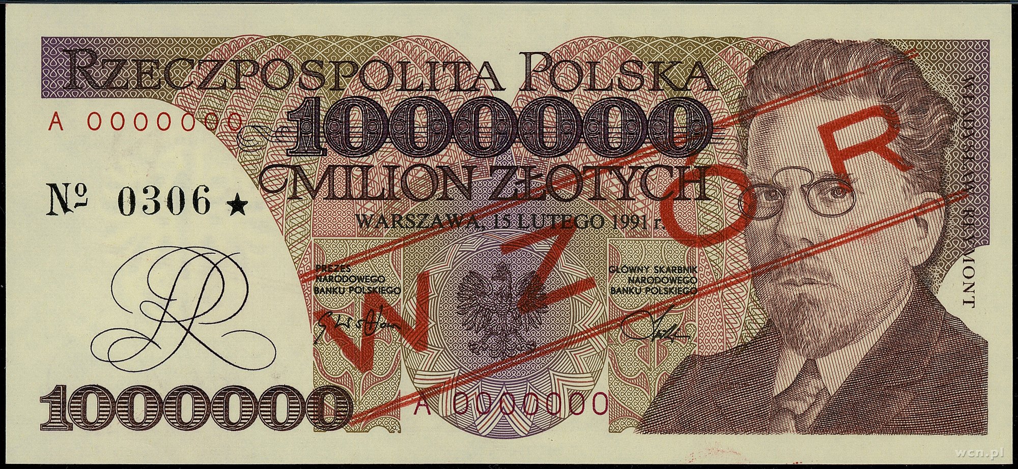 1.000.000 złotych, 15.02.1991; seria A, numeracja 0000000, czerwony nadruk SPECIMEN/WZÓR, dodatkowa numeracja wzoru 0306*; Lucow 1541 (R5), Miłczak 189Wa; piękny bank..