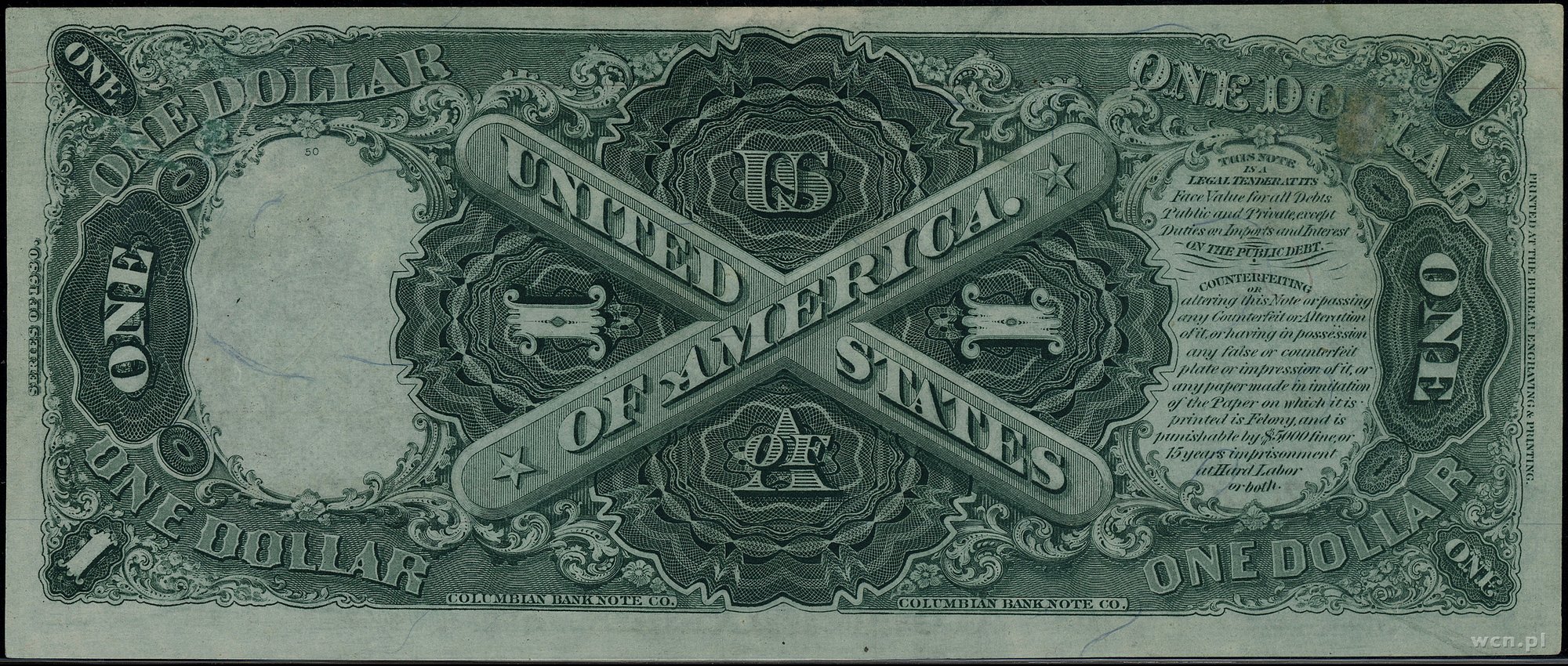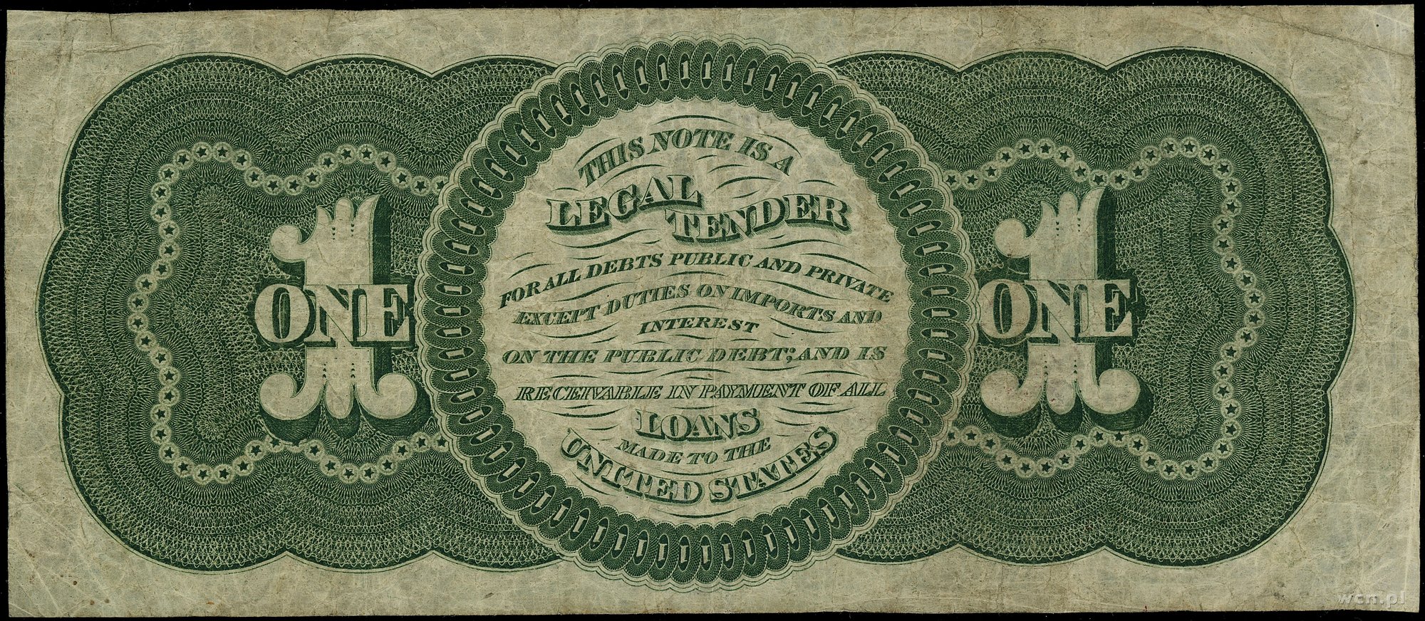 | 432 | Stany Zjednoczone Ameryki (USA) / Legal Tender Note 1 dolar, 1.08.1862; seria 144 D, numeracja 55780, podpisy Chittenden i Spinner; Fr. 17a; złamania, zagniecenia papieru, bardzo rzadki typ banknotu. |