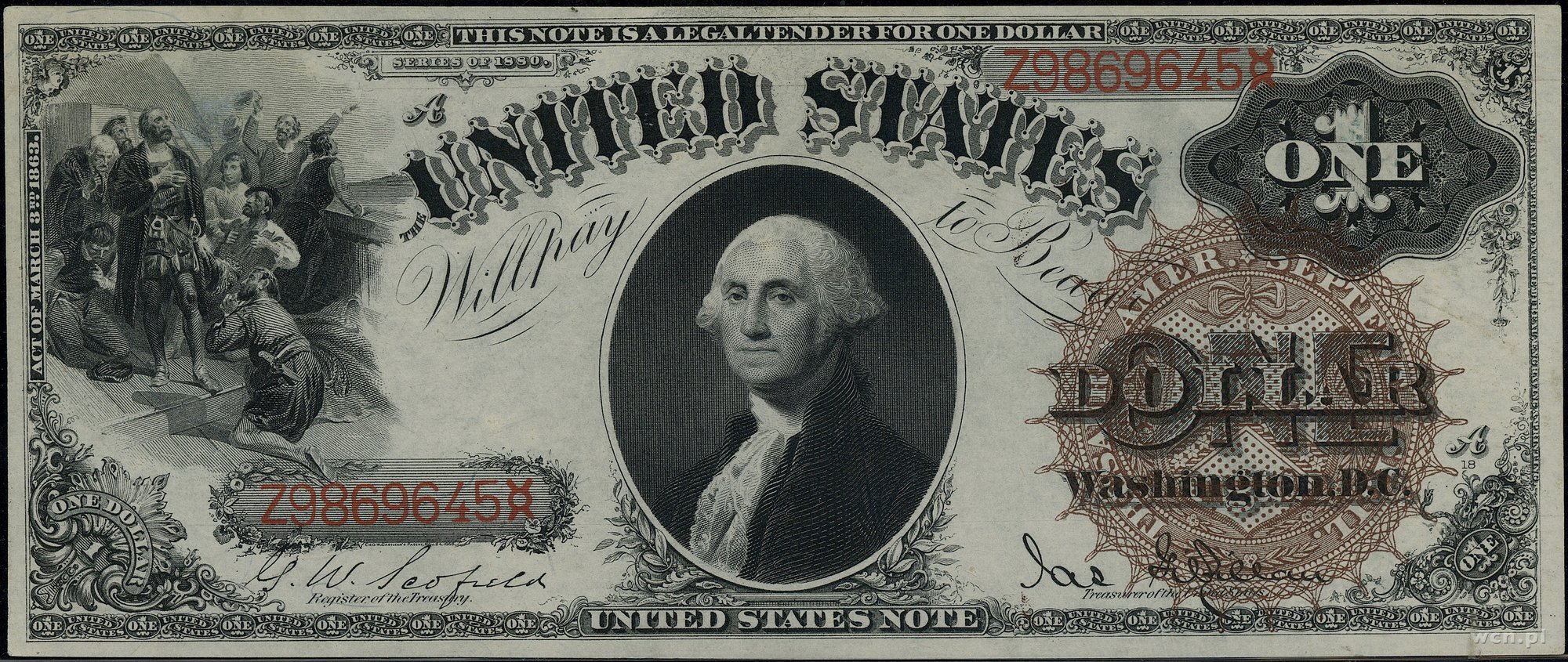 | 433 | Stany Zjednoczone Ameryki (USA) / Legal Tender Note 1 dolar, 1880; seria Z9869645, podpisy Scofield i Gilfillan; Fr. 28; plamka na odwrocie, banknot pięknej prezencji w opakowaniu firmy C.G.A. z oceną Choice Uncirculat.. |