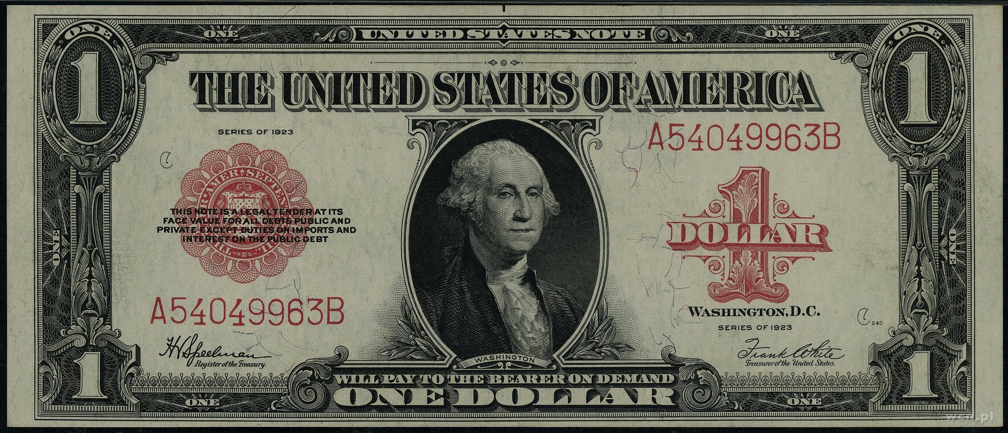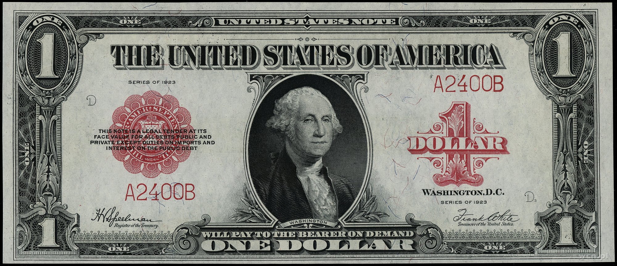 | 434 | Stany Zjednoczone Ameryki (USA) / Legal Tender Note 1 dolar, 1923; seria A2400B (rzadkość – niski czterocyfrowy numer seryjny), podpisy Speelman i White, czerwona pieczęć; Fr. 40; małe ugięcie przy lewym górnym rogu, m.. |