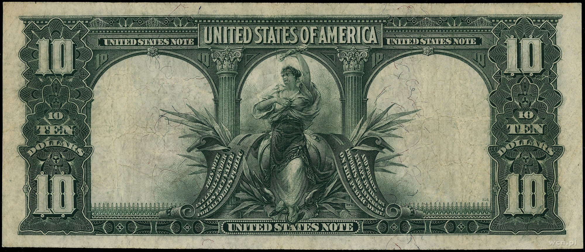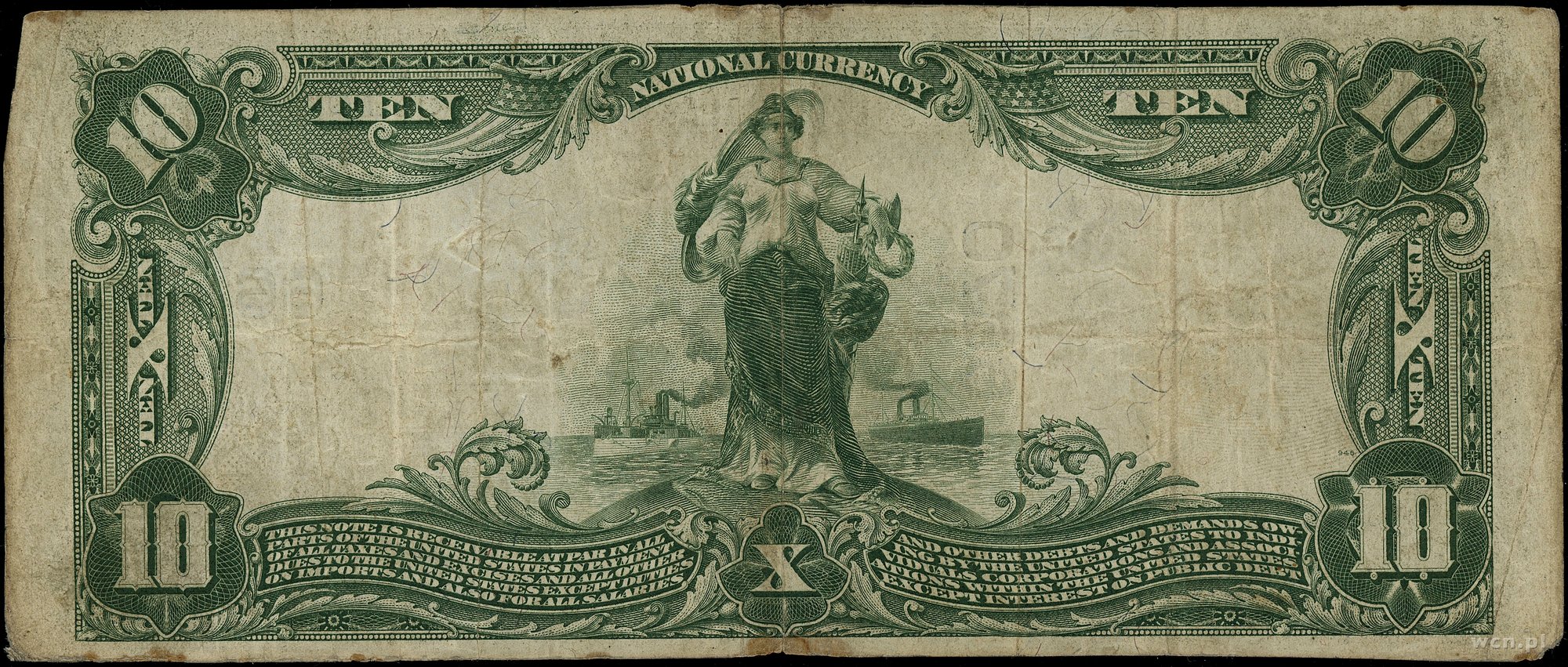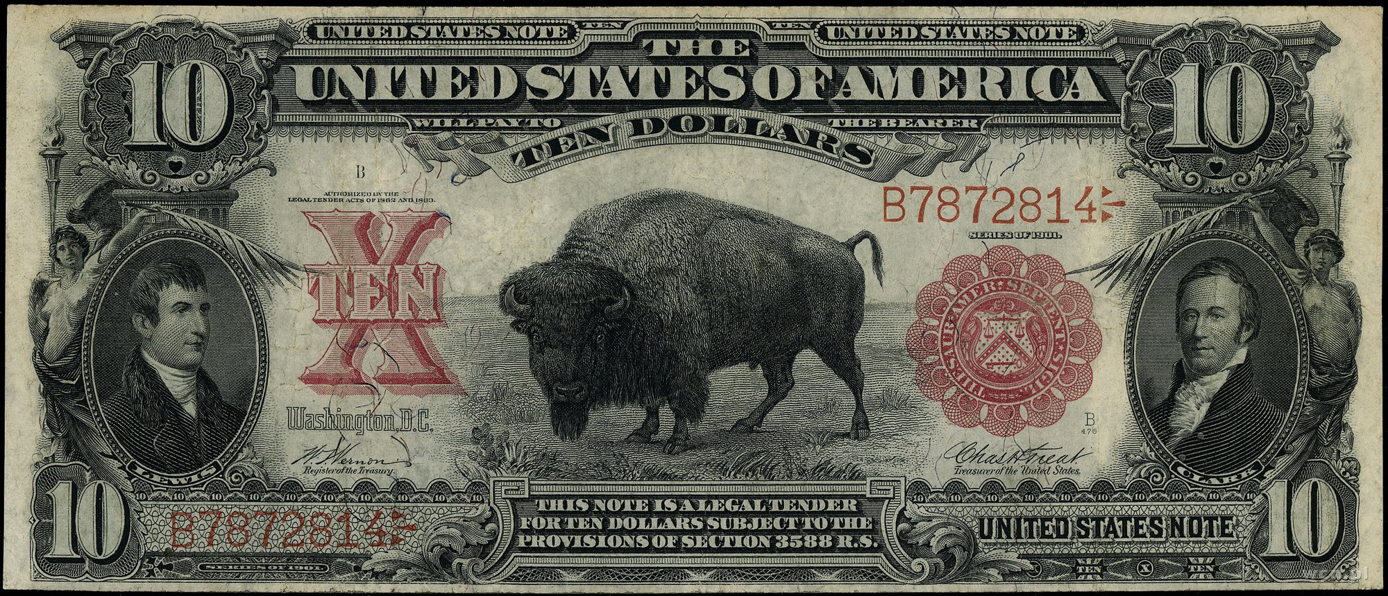 | 436 | Stany Zjednoczone Ameryki (USA) / Legal Tender Note 10 dolarów, 1901; seria B7872814, podpisy Vernon i Treat, czerwona pieczęć; Fr. 116; wielokrotnie złamane, banknot po konserwacji, rzadki typ. |