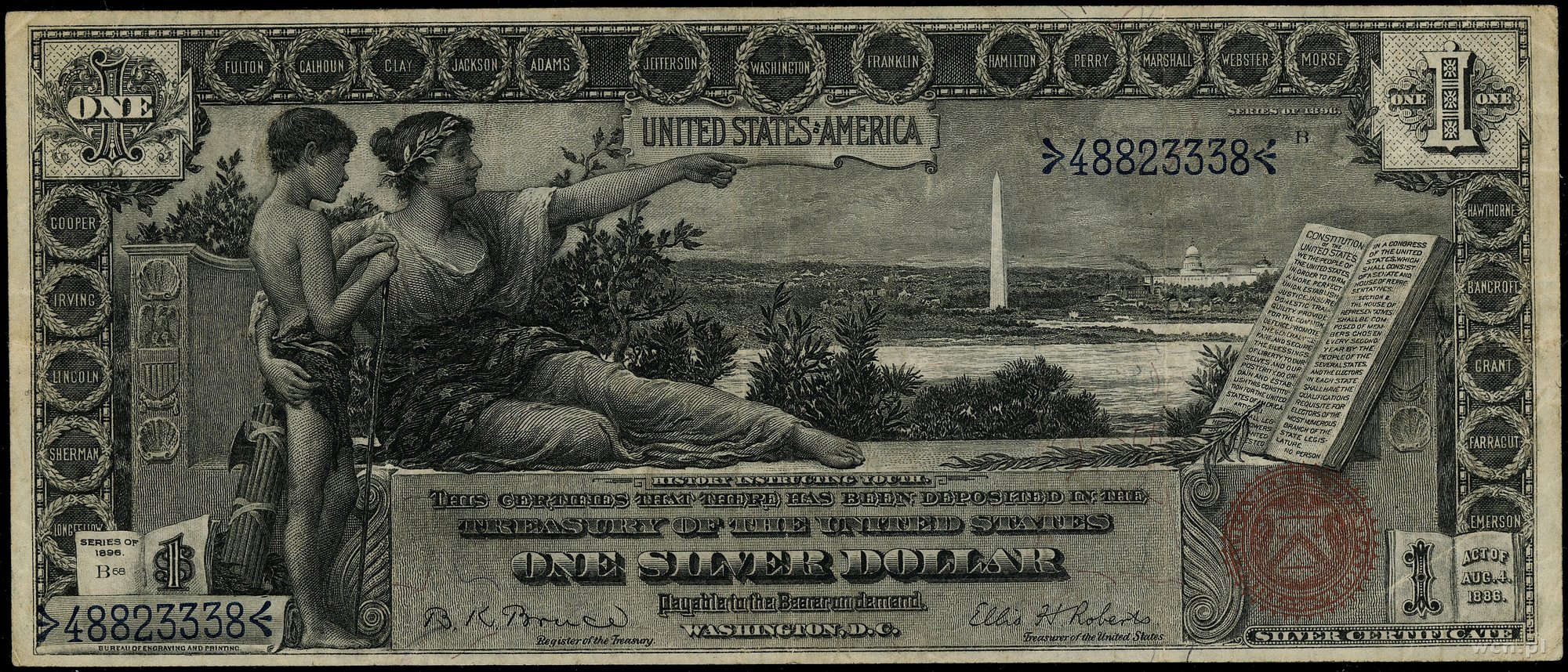 | 437 | Stany Zjednoczone Ameryki (USA) / Silver Certificate 1 dolar, 1896; numeracja 48823338, podpisy Bruce i Roberts, czerwona pieczęć; Fr. 225; złamania w pionie i poziomie, ale przyzwoitej prezencji banknot, rzadki typ. |