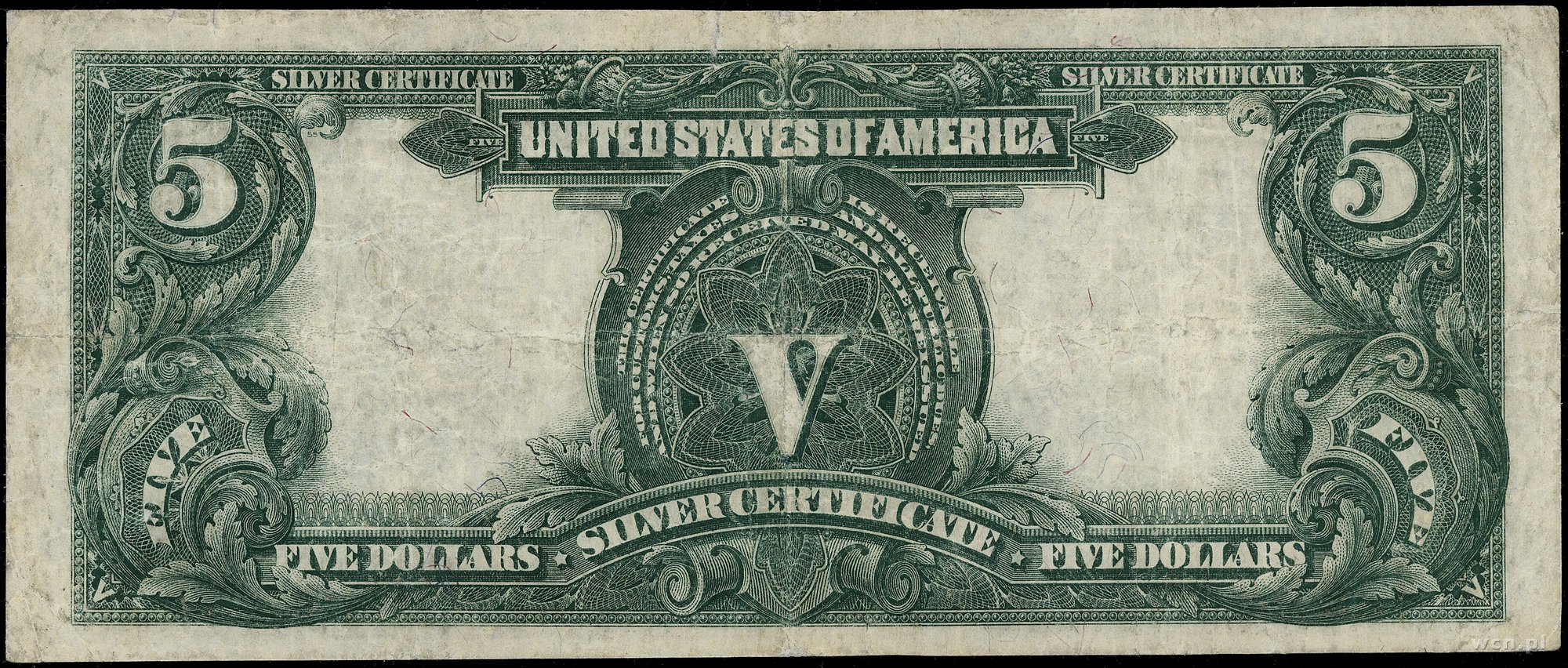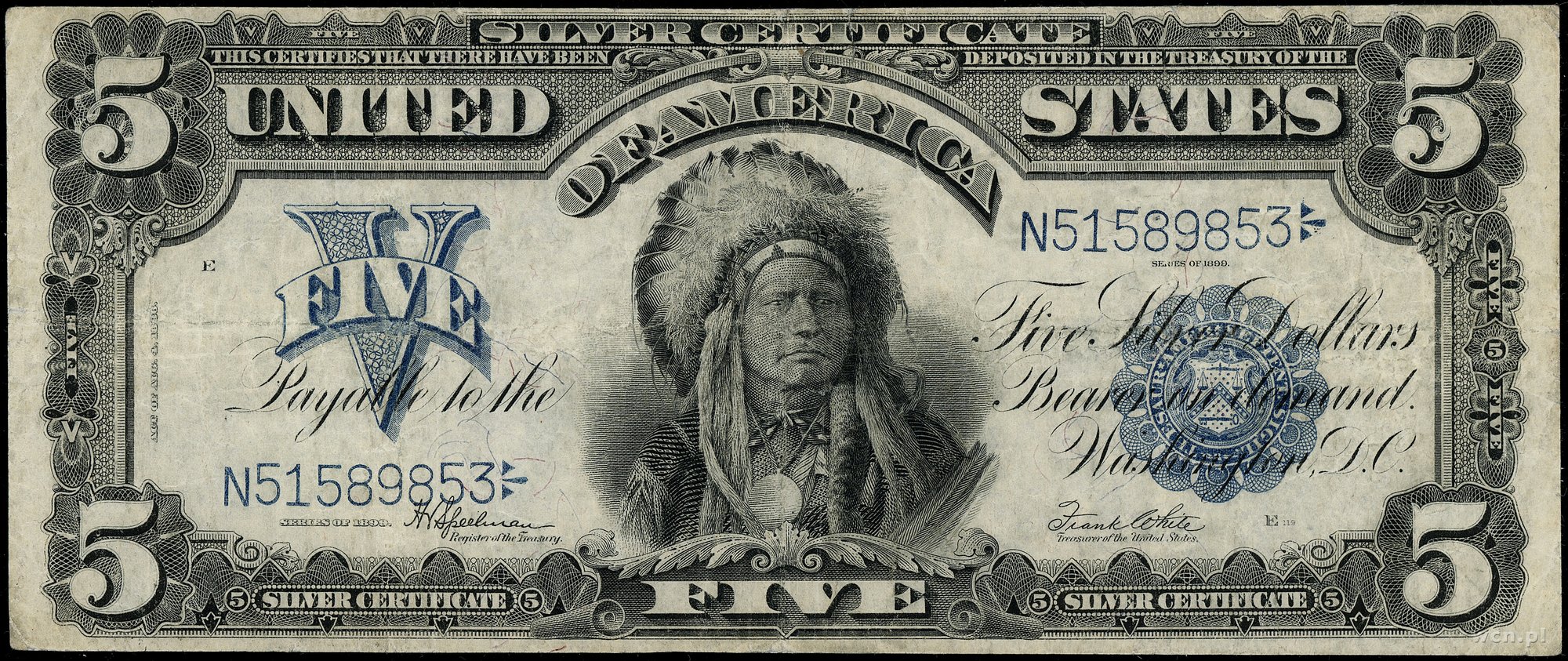 | 438 | Stany Zjednoczone Ameryki (USA) / Silver Certificate 5 dolarów, 1899; seria N51589853, Speelman i White, niebieska pieczęć; Fr. 281; złamania w pionie i poziomie, banknot po delikatnej konserwacji, rzadki typ. |
