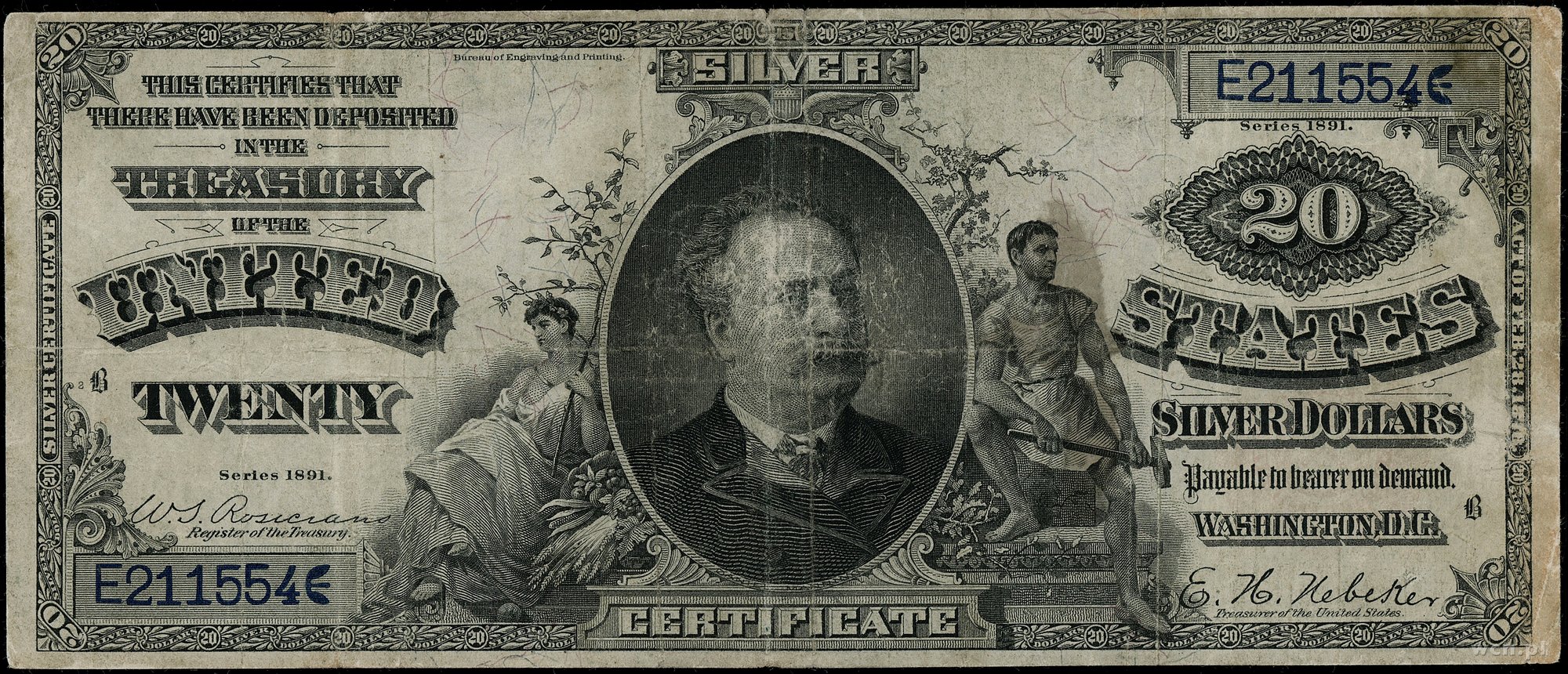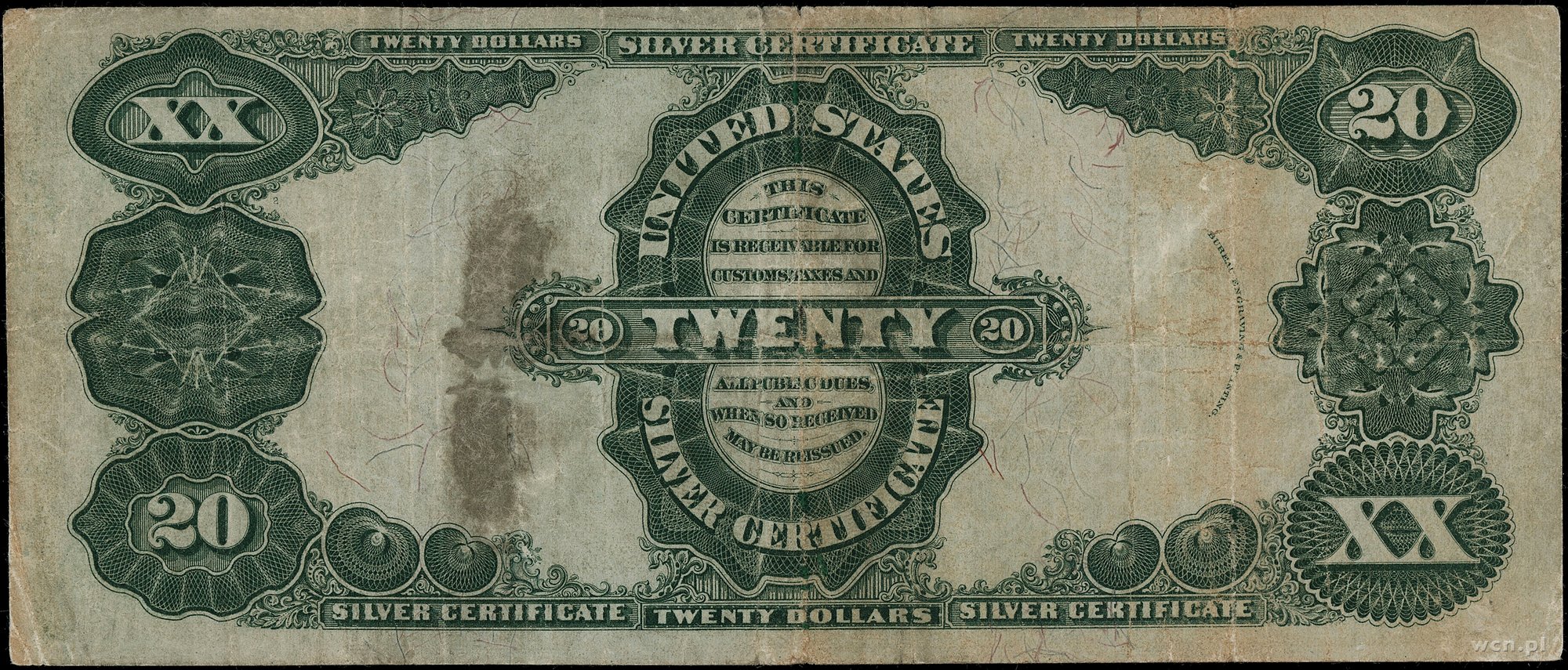 | 439 | Stany Zjednoczone Ameryki (USA) / Silver Certificate 20 dolarów, 1891; seria E211554, podpisy Rosecrans i Nebeker; Fr. 317; złamania w pionie i poziomie, po subtelnej konserwacji, rzadki typ banknotu. |