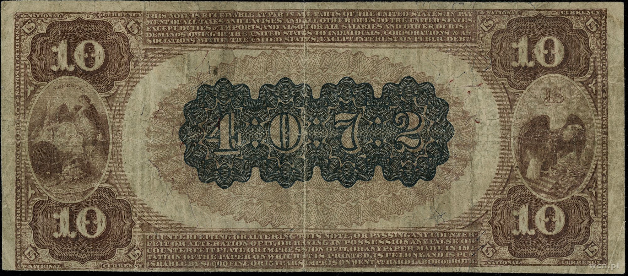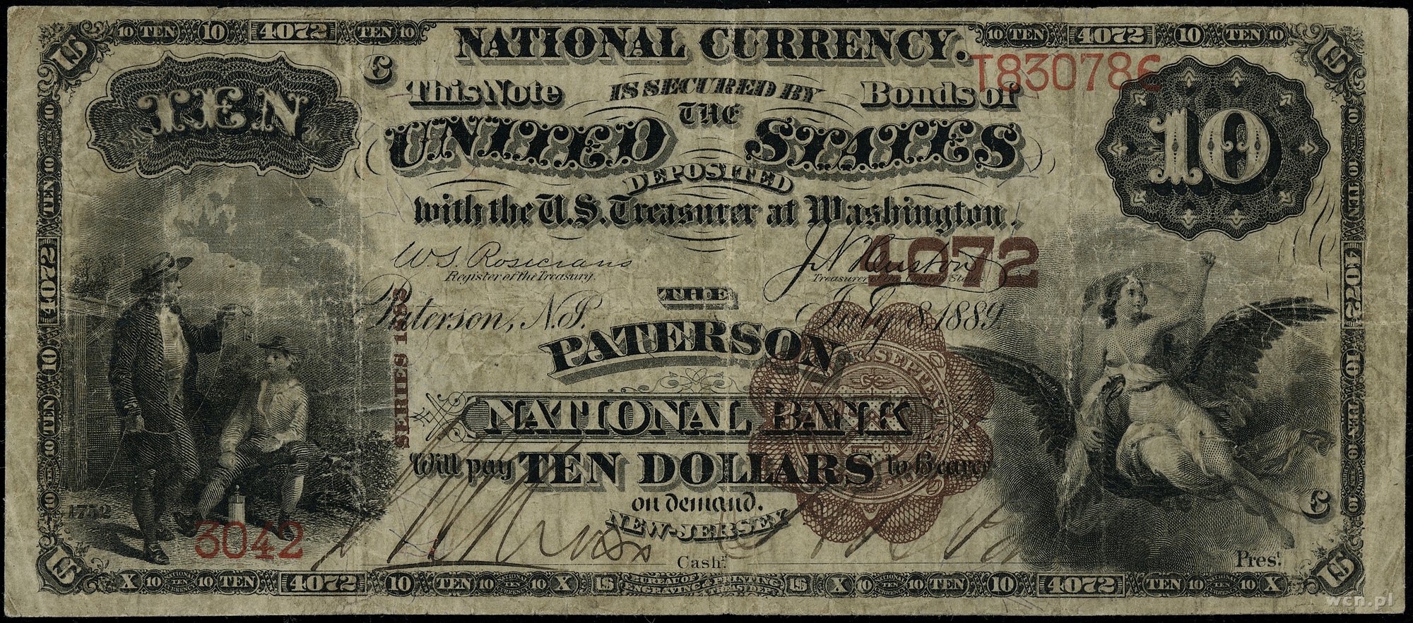 | 440 | Stany Zjednoczone Ameryki (USA) / National Currency The Paterson National Bank New Jersey (4072); 10 dolarów, 1889; seria T830786 / 3042, podpisy Rosecrans i Huston, brązowa pieczęć; Fr. 484; złamania w pionie i poziom.. |