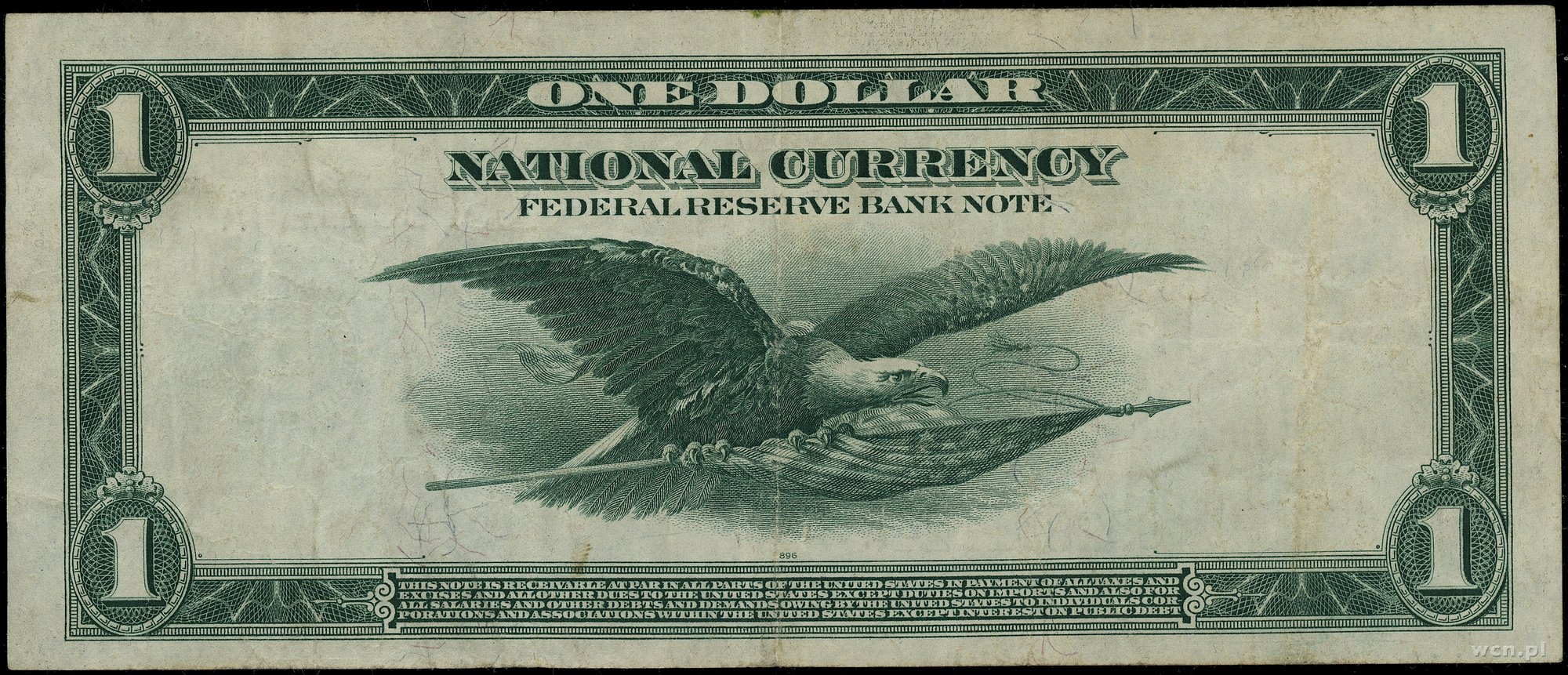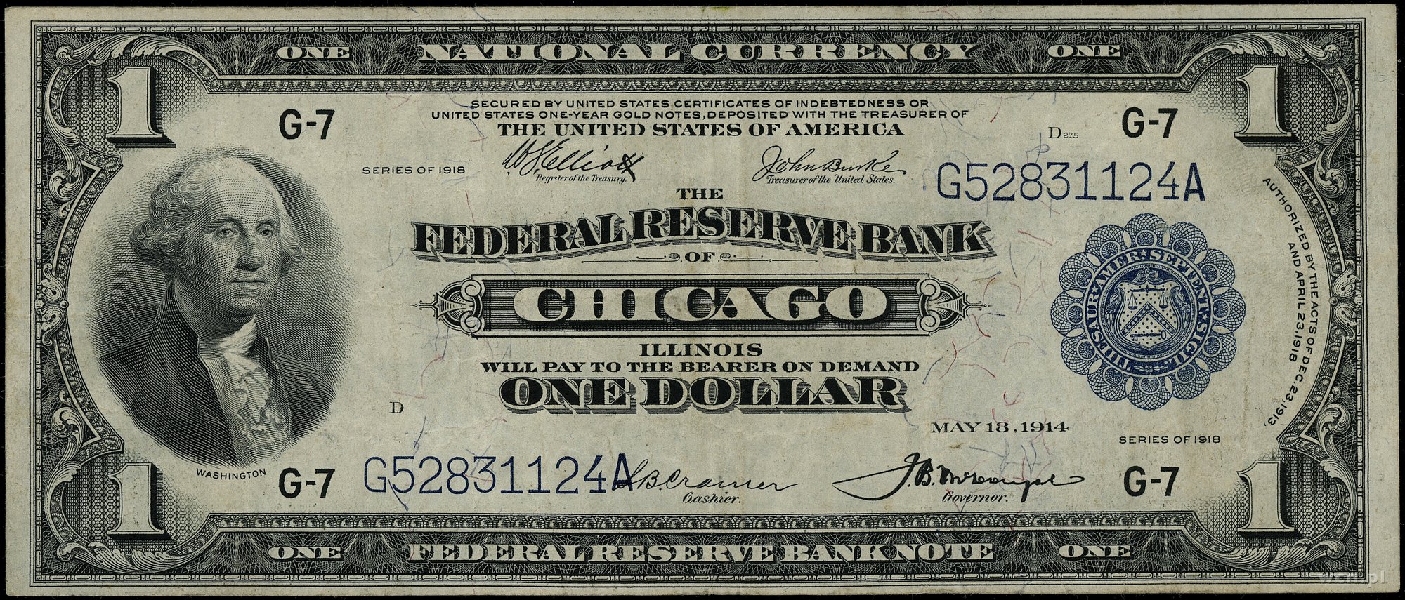 | 441 | Stany Zjednoczone Ameryki (USA) / Federal Reserve Bank Notes Illinois – Chicago; 1 dolar, 1918; seria G52831124A, podpisy Elliot, Burke, Cramer, McDougal, niebieska pieczęć; Fr. 729; kilka złamań, zagniecenia papieru, przyzwoit.. |