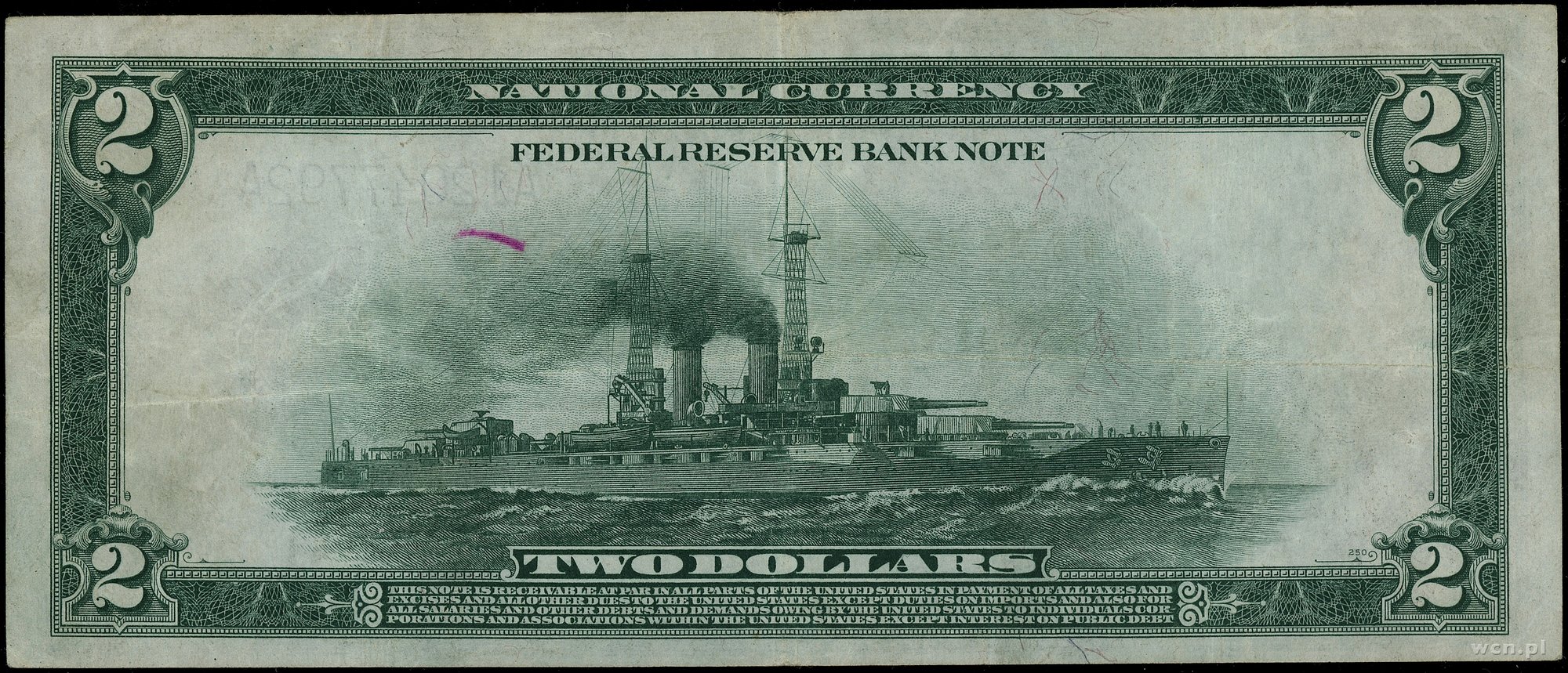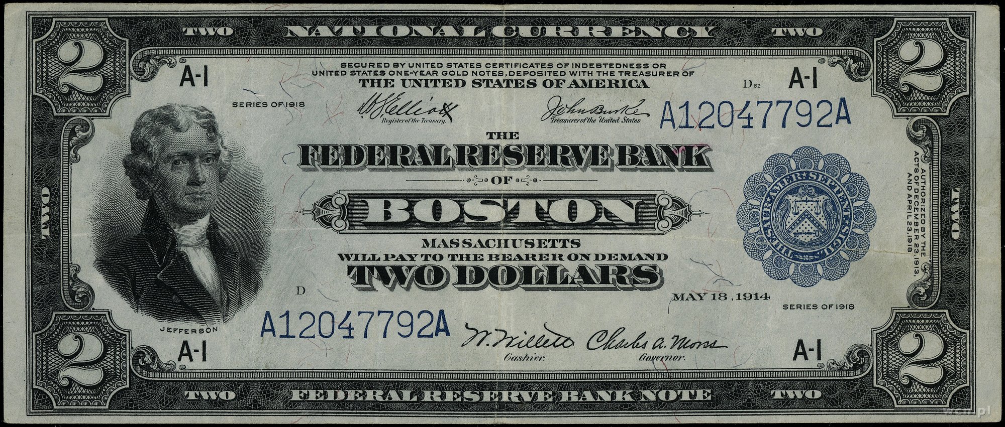 | 442 | Stany Zjednoczone Ameryki (USA) / Federal Reserve Bank Notes Massachusetts – Boston; 2 dolary, 1918; seria A12047792A, podpisy Elliott, Burke, Willett i Morss; Fr. 749; kilka złamań lub ugięć, ale ładnej prezencji banknot. |