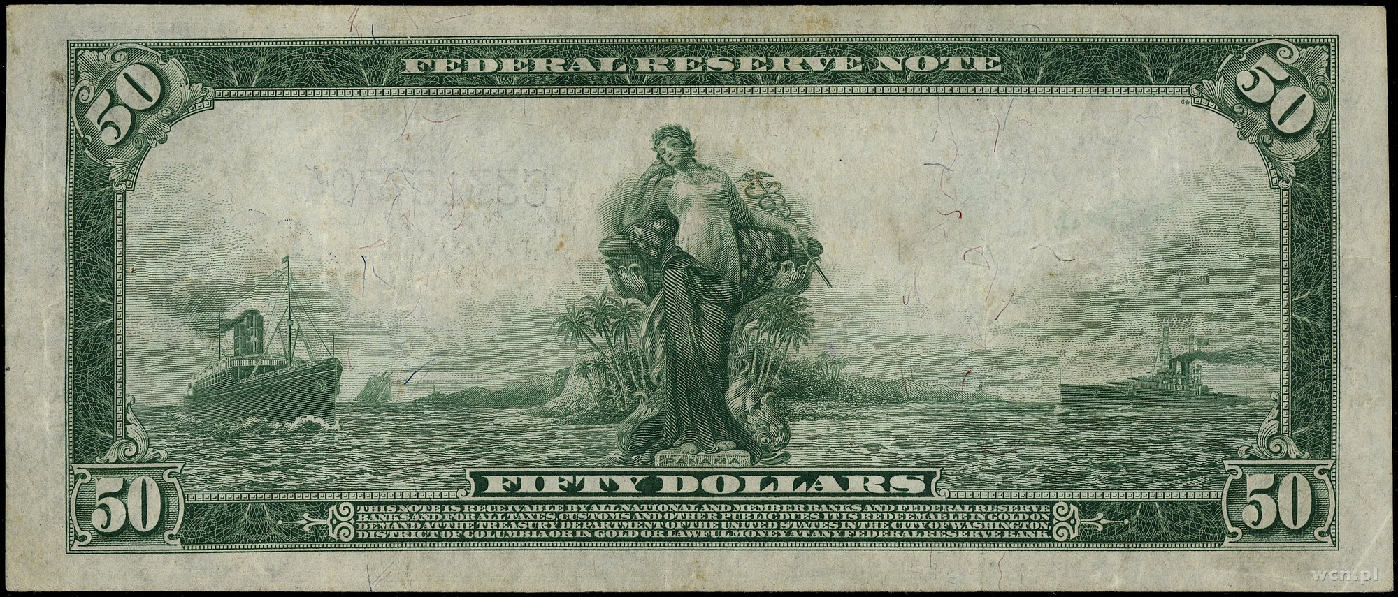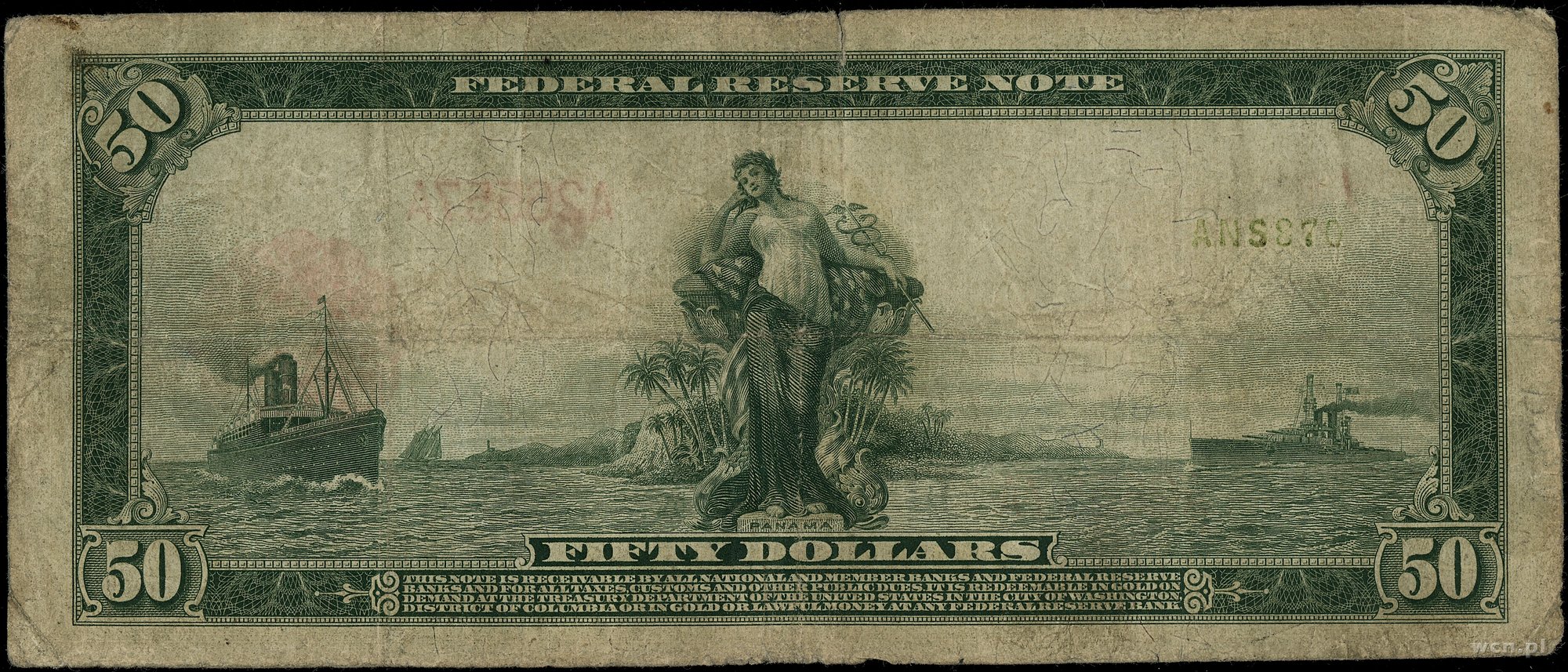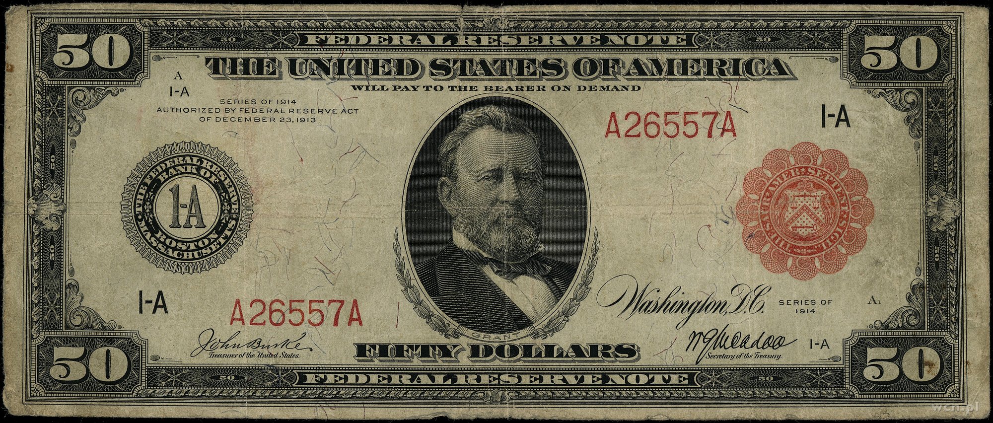 | 443 | Stany Zjednoczone Ameryki (USA) / Federal Reserve Bank Notes Massachusetts – Boston; 50 dolarów, 1914; seria A26557A, podpisy: Burke i McAdoo, czerwona pieczęć; Fr. 1012A, złamania w pionie i poziomie, drobne naddarcia, nieświe.. |