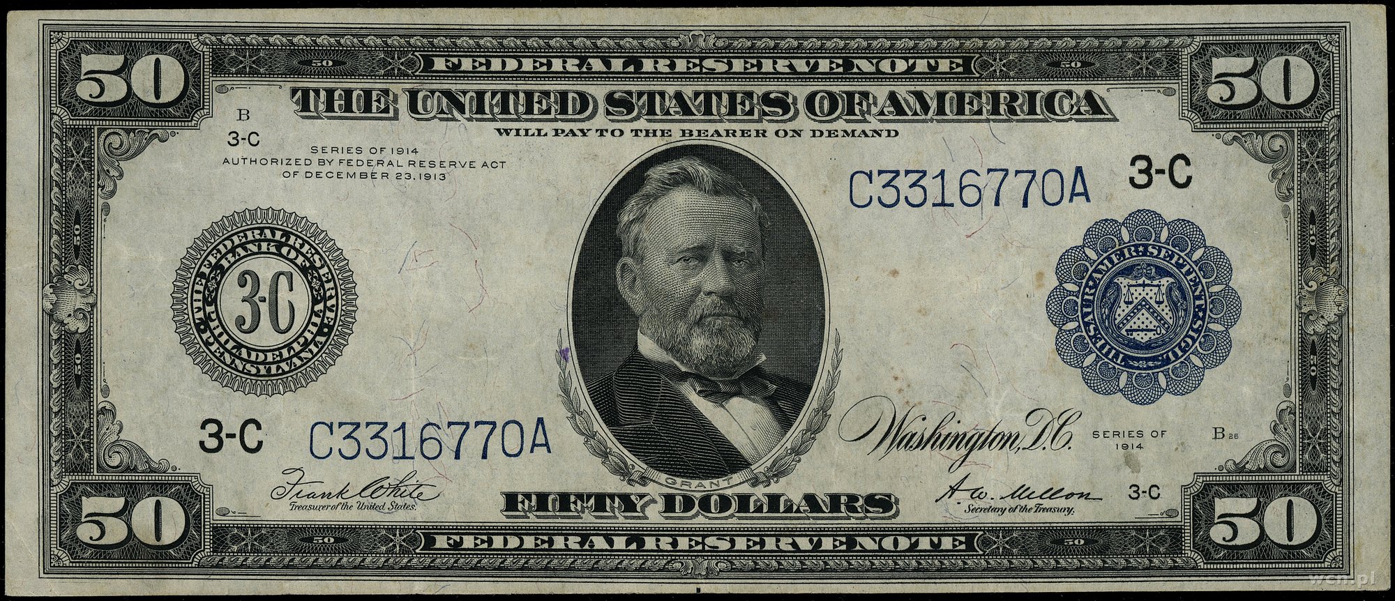 | 444 | Stany Zjednoczone Ameryki (USA) / Federal Reserve Bank Notes Pensylwania – Filadelfia; 50 dolarów, 1914; seria C3316770A, podpisy White i Mellon, niebieska pieczęć; Fr. 1035; parokrotnie złamane, minimalne przebarwienia, delika.. |