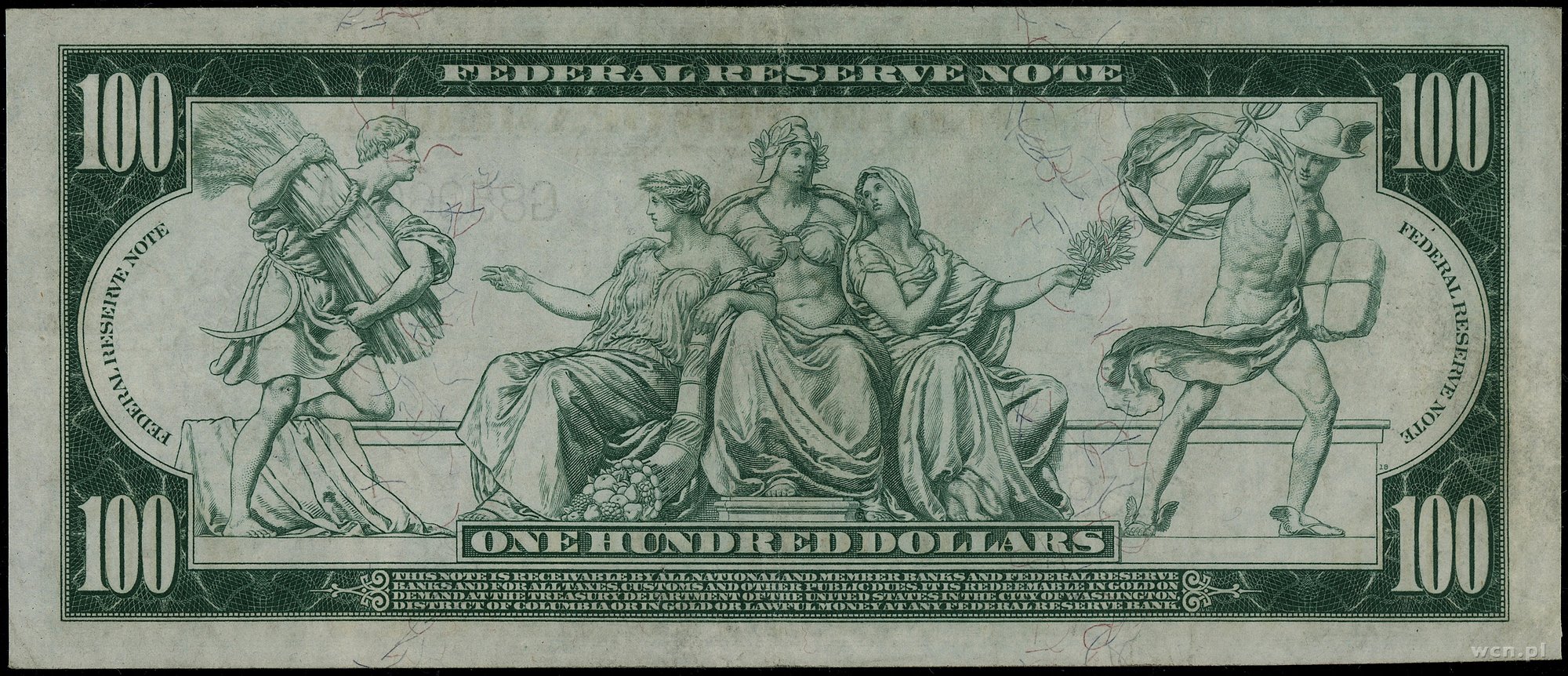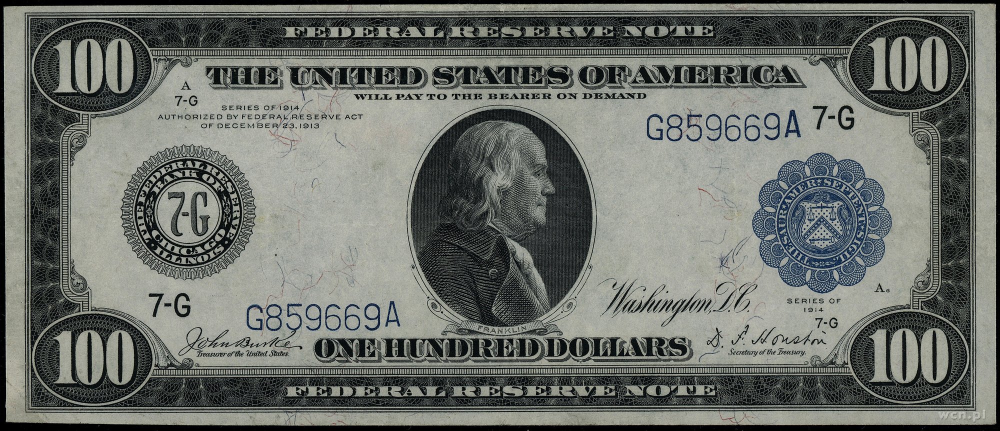 | 445 | Stany Zjednoczone Ameryki (USA) / Federal Reserve Bank Notes Illinois – Chicago; 100 dolarów, 1914; seria G859669A, podpisy Burke i Houston, niebieska pieczęć; Fr. 1110; ugięcia i nieświeżości papieru, ale ładnej prezencji bank.. |