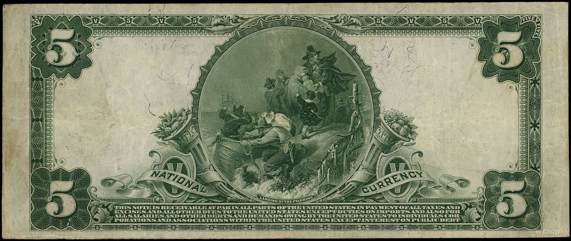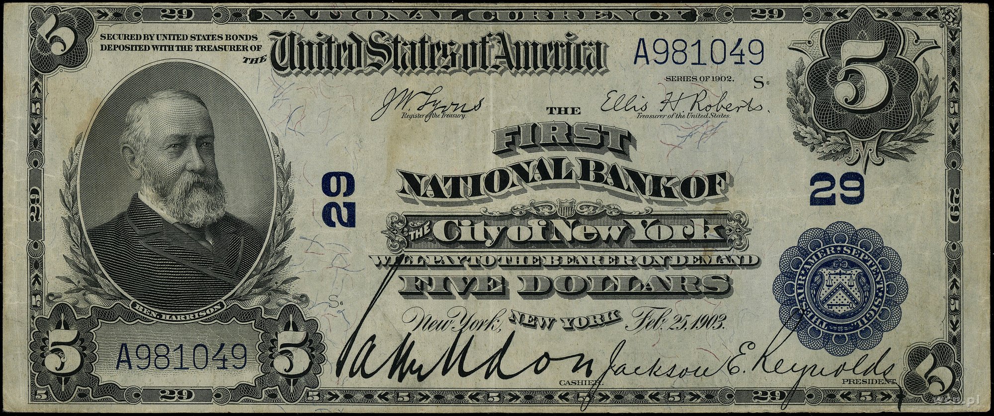 | 446 | Stany Zjednoczone Ameryki (USA) / National Currency The First National Bank of City of New York (29); 5 dolarów, 25.02.1903; seria A981049, podpisy Lyons i Roberts, niebieska pieczęć; Fr. S-1339; złamania w pionie, mie.. |
