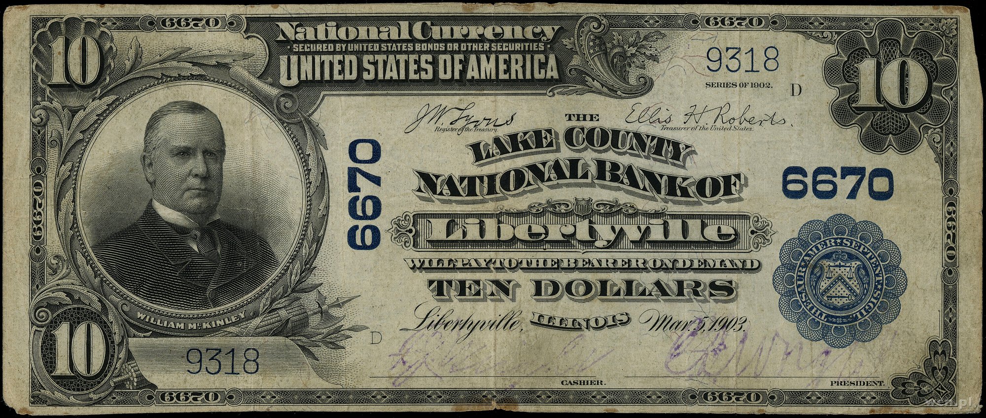 | 447 | Stany Zjednoczone Ameryki (USA) / National Currency The Lake County National Bank of Libertyville – Illinois (6670); 10 dolarów, 5.03.1903; numeracja 9318, podpisy Lyons i Roberts, niebieska pieczęć; Friedberg S-1435; .. |