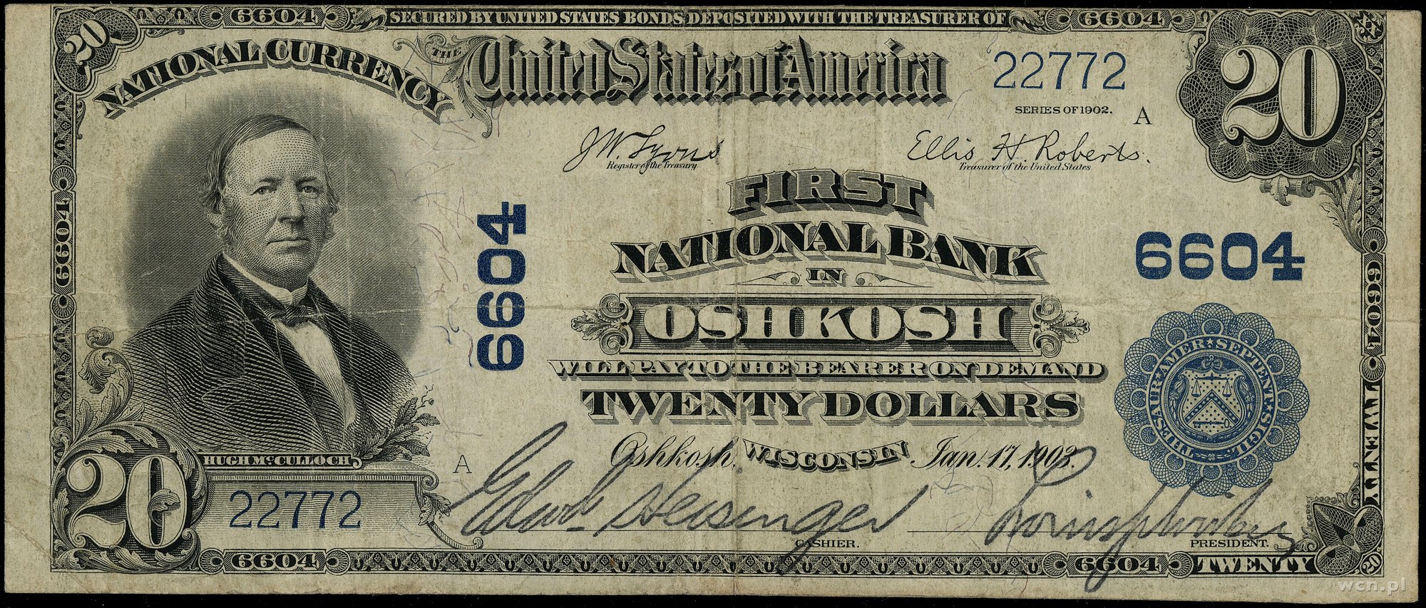 | 448 | Stany Zjednoczone Ameryki (USA) / National Currency First National Bank in Oshkosh - Wisconsin (6604); 20 dolarów, 17.01.1903; numeracja 22772, podpisy Lyons i Roberts, niebieska pieczęć; Friedberg S-1682; złamania w p.. |