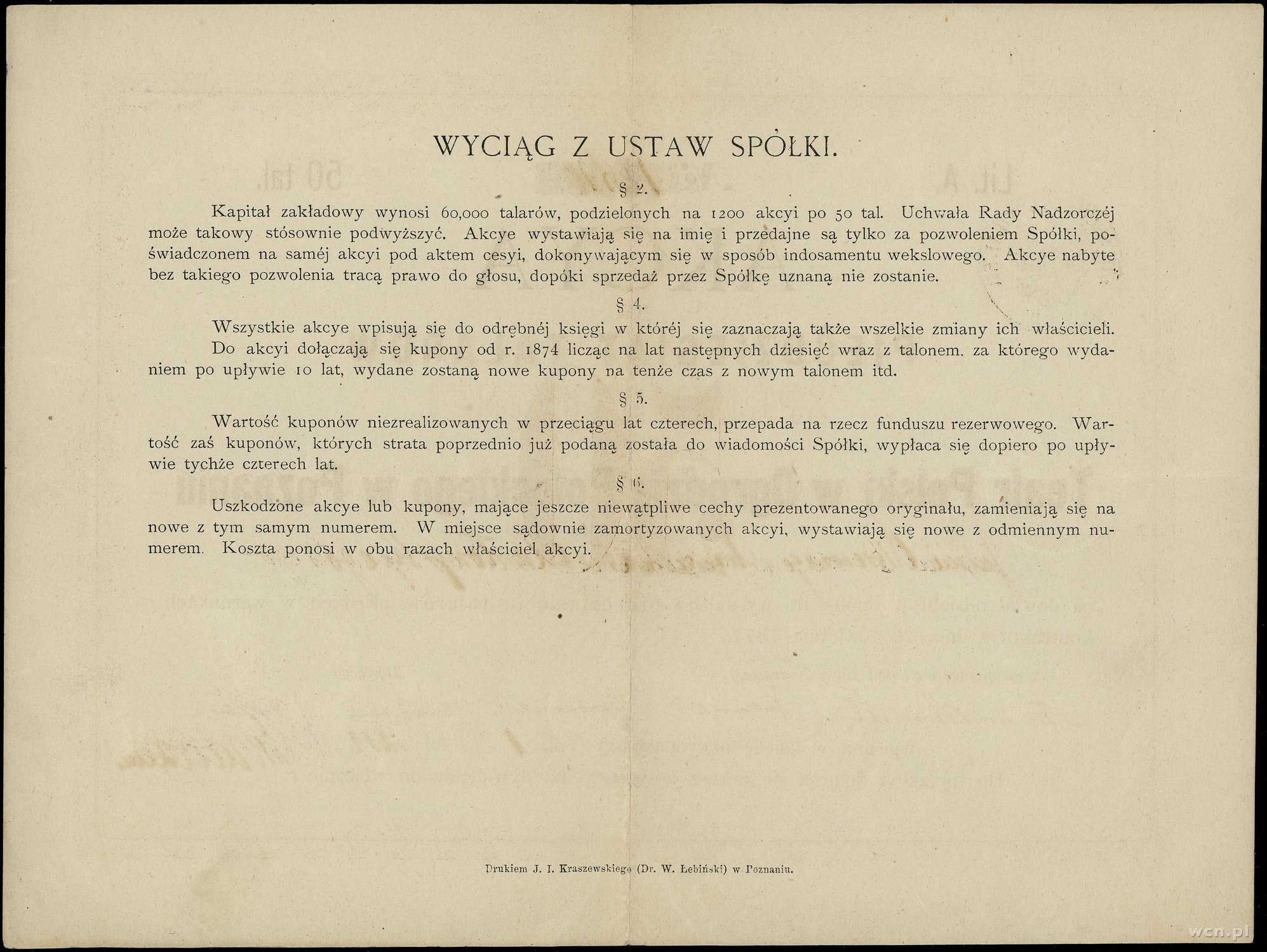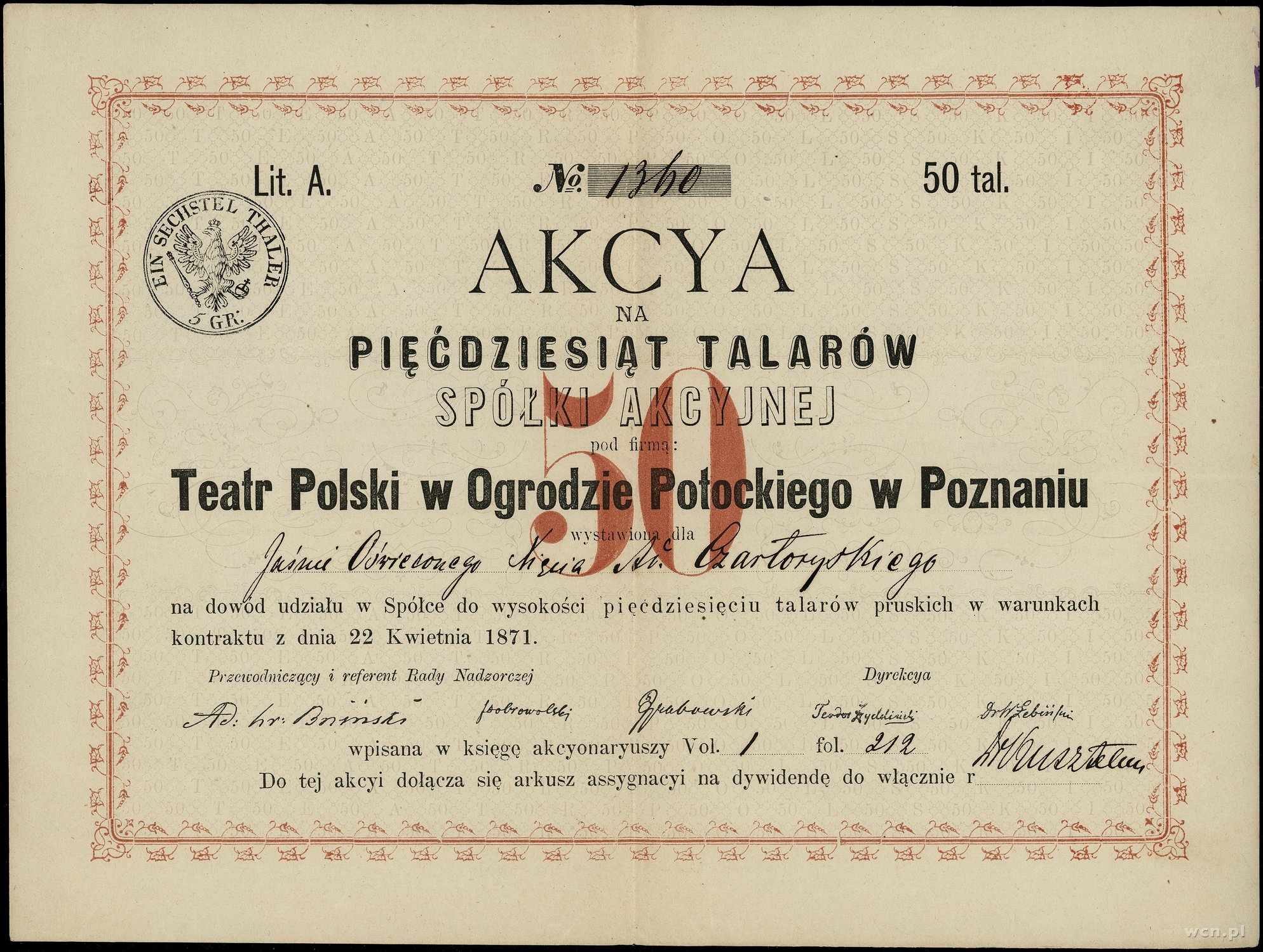 | 449 | Teatr Polski w Ogrodzie Potockiego w Poznaniu S.A. Akcja imienna na 50 talarów pruskich wystawiona na Jaśnie Oświeconego księcia Władysława Czartoryskiego przywódcy konserwatywno-liberalnego obozu politycznego Hôtel L.. |