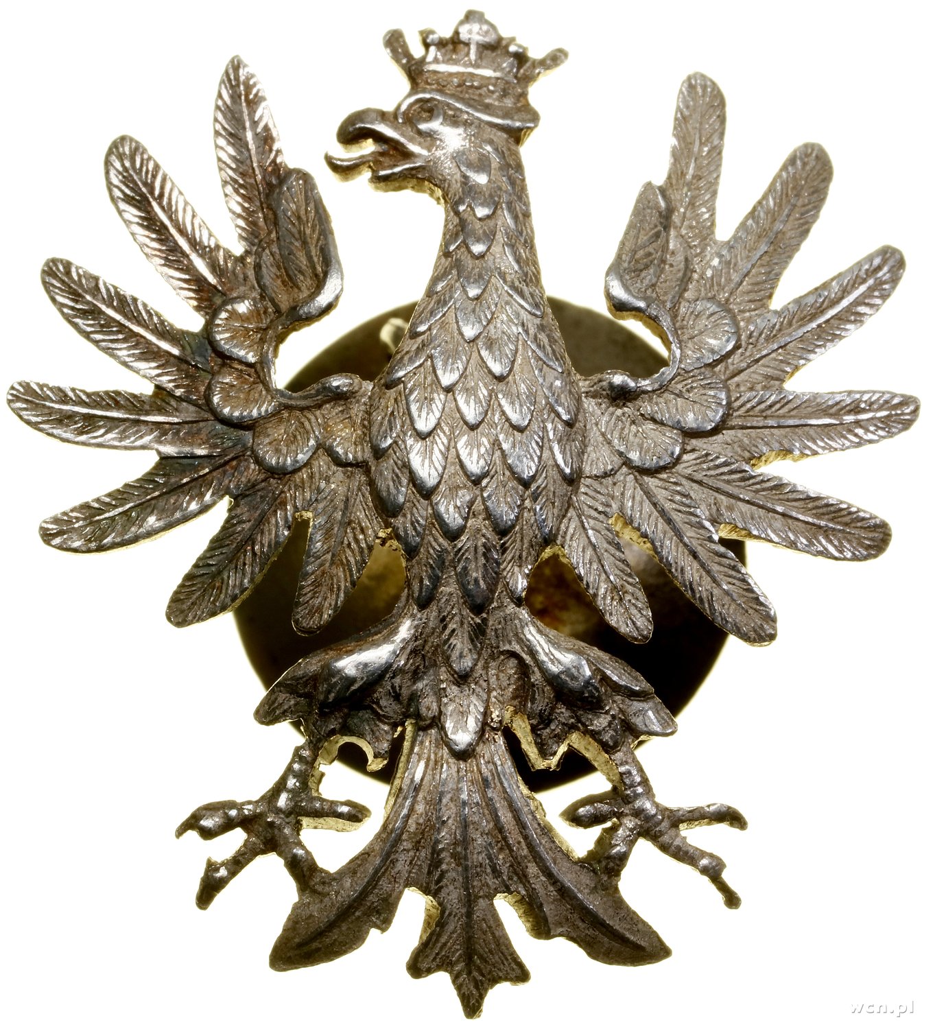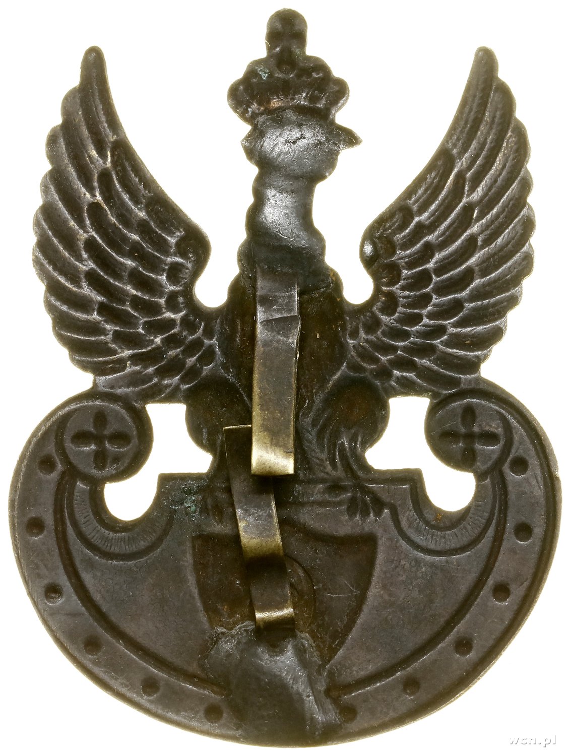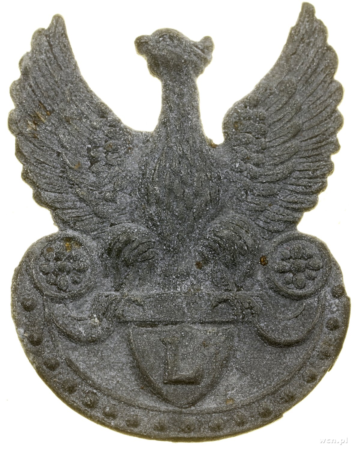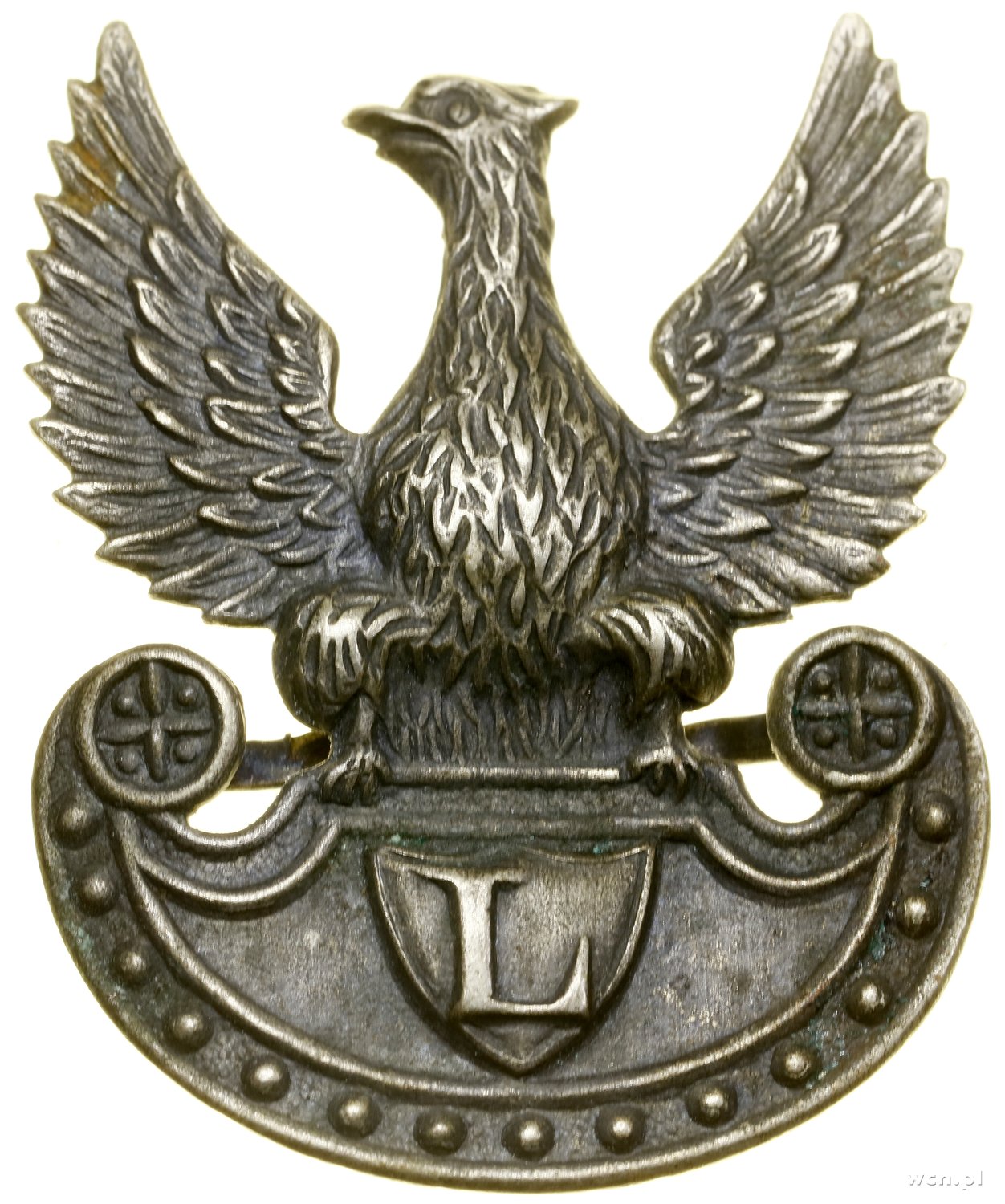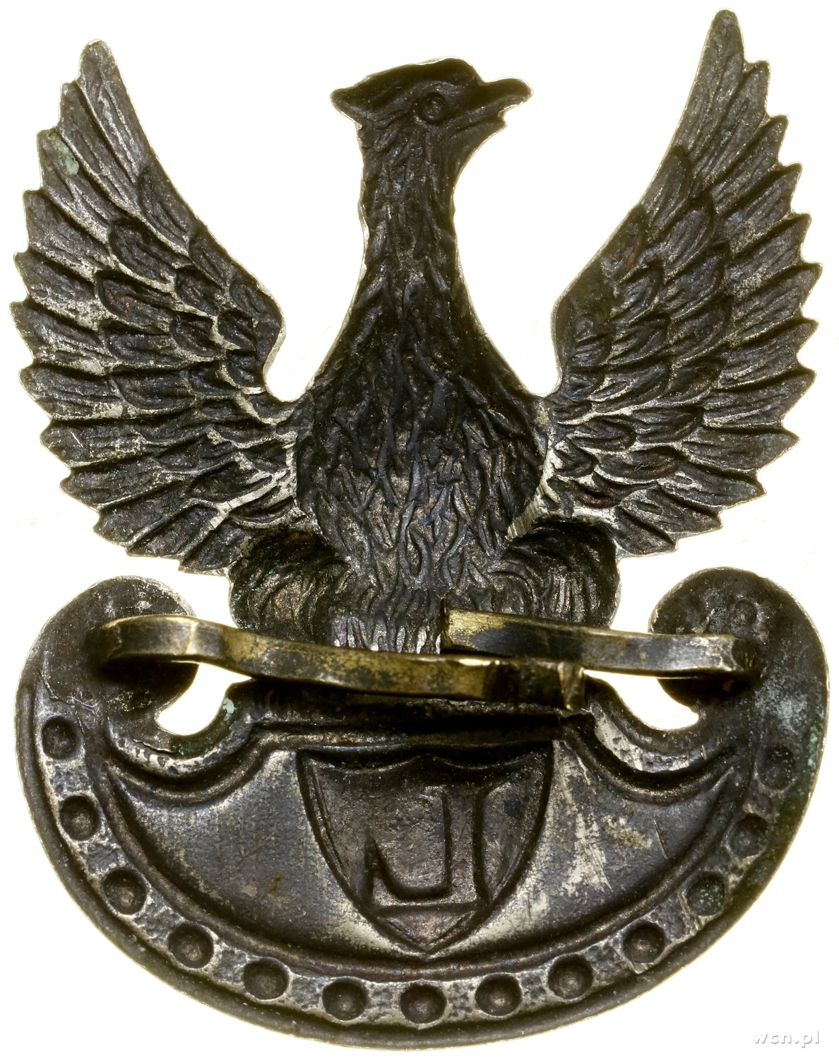 | 468 | POLSKA / I wojna światowa (1914–1918) Orzeł do czapki, 1916, Kraków; Orzeł z rozpostartymi skrzydłami, stojący na tarczy amazonek, w tarczy litera L, bity z kontrą, mocowany na dwie blaszki; Zawistowski 9.. |