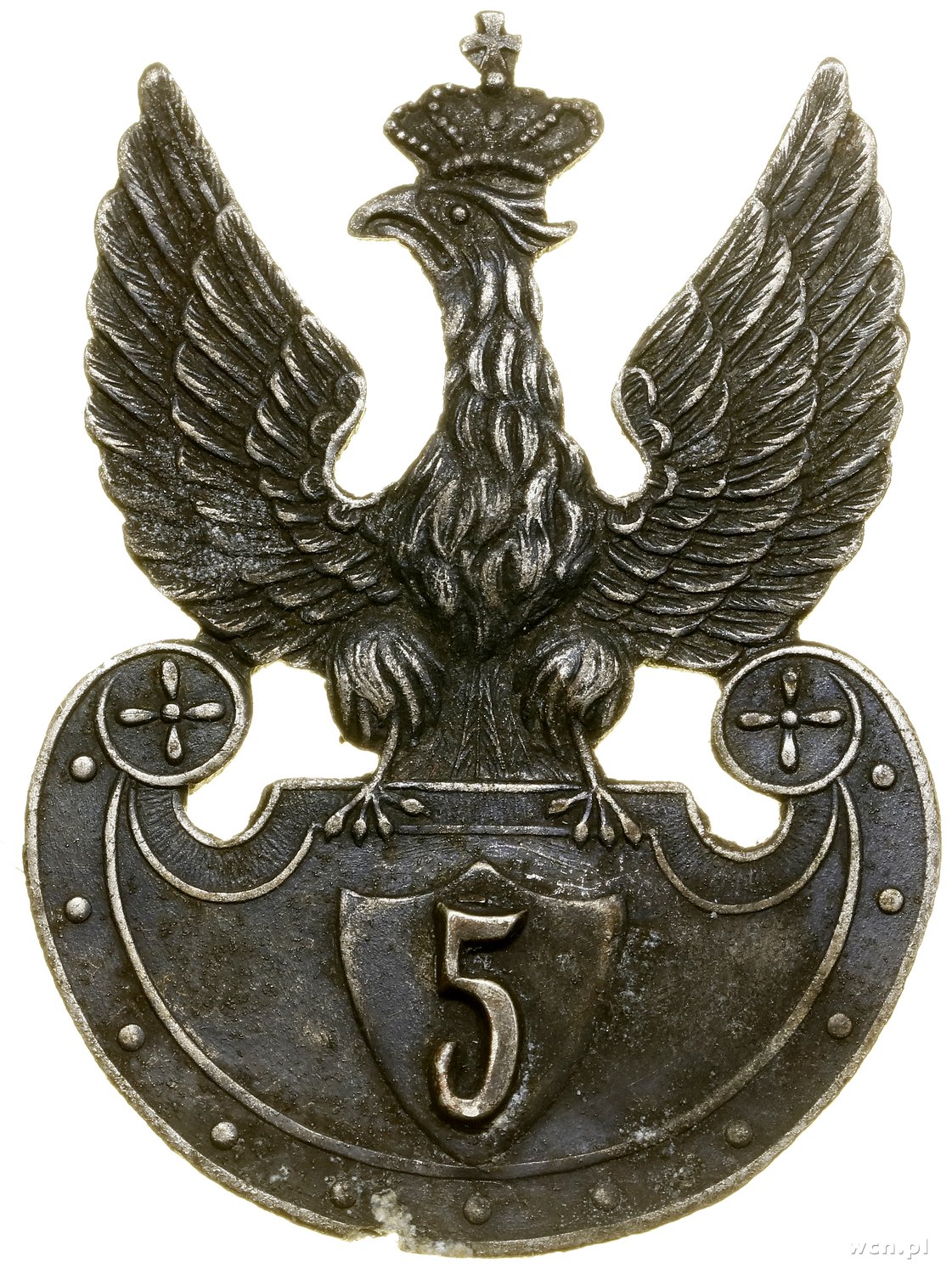 | 466 | POLSKA / I wojna światowa (1914–1918) Orzeł do czapki, 1916, Kraków; Ukoronowany orzeł z rozpostartymi skrzydłami, stojący na tarczy amazonek, w tarczy cyfra 5, bity z kontrą, mocowany na dwie blaszki; Za.. |