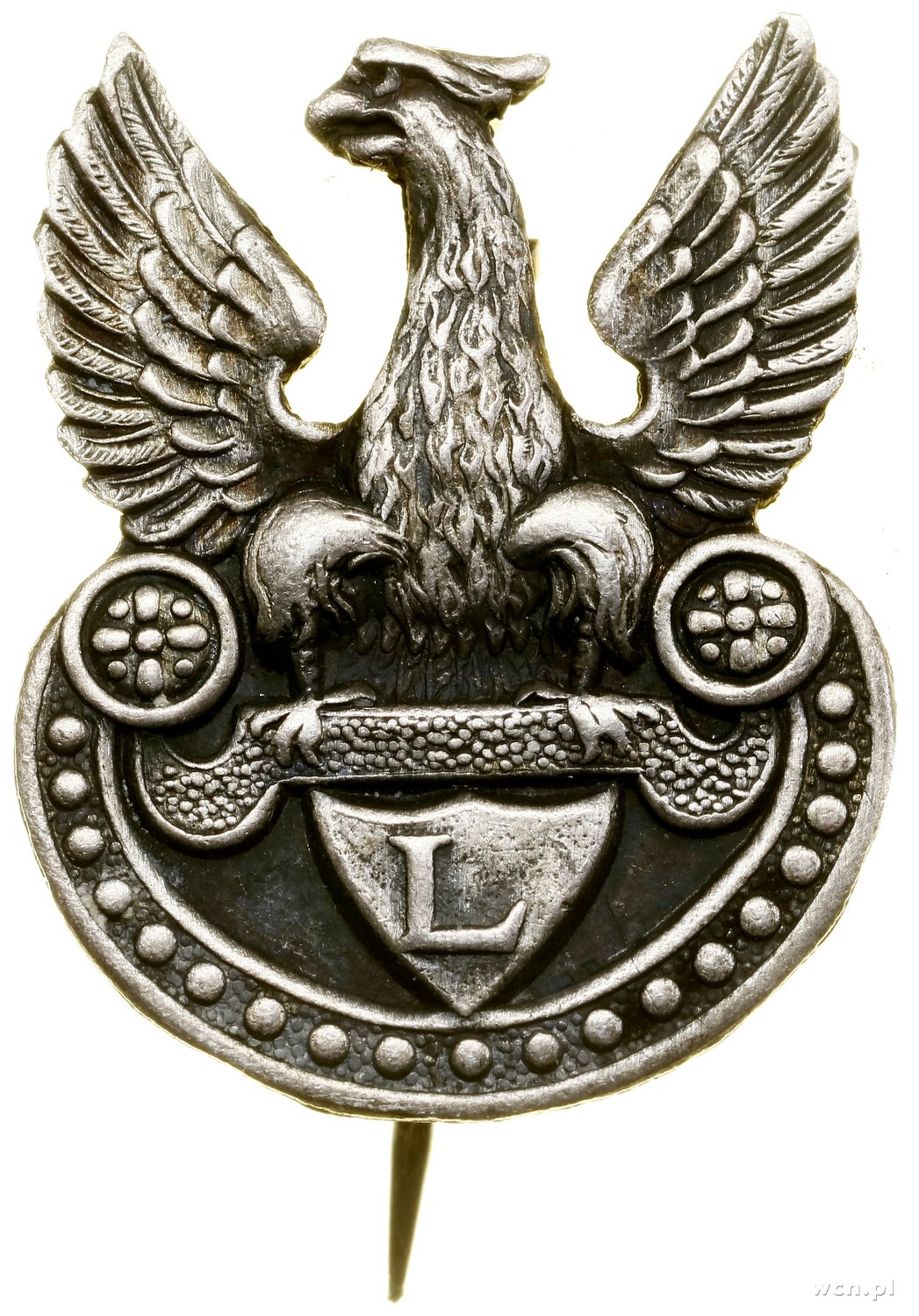 | 472 | POLSKA / I wojna światowa (1914–1918) Wpinka patriotyczna; Orzeł z rozpostartymi skrzydłami, stojący na tarczy amazonek, w tarczy litera L, bity z kontrą, mocowany na agrafkę; metal srebrzony, 20.0 x 24.9.. |