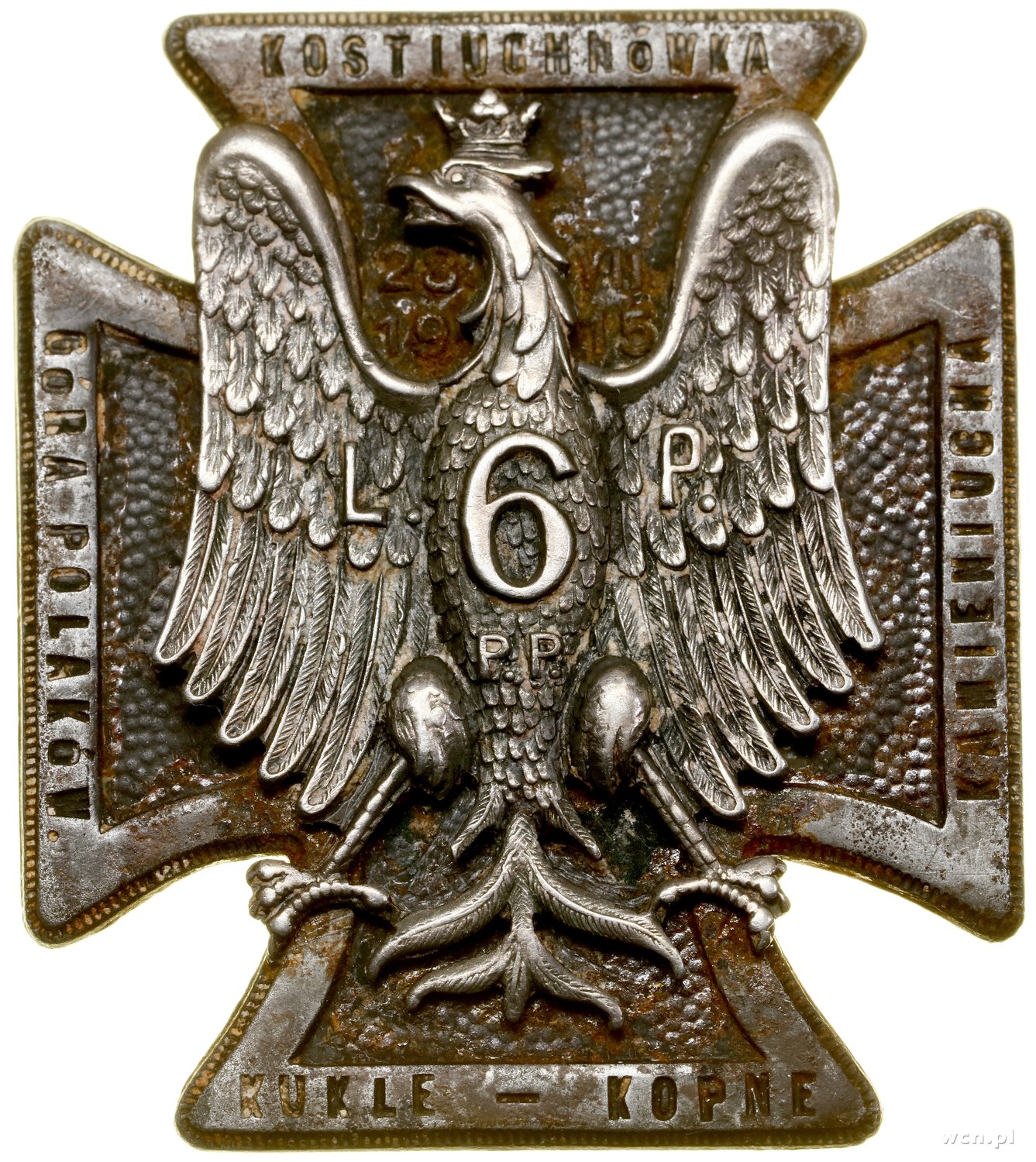 | 475 | II Rzeczpospolita (1918–1939) 6. Pułk Piechoty Legionów – odznaka pamiątkowa z miniaturą, (1921–1929); Krzyż, na krawędziach ramion KOSTIUCHNÓWKA - GÓRA POLAKÓW - KAMIENIUCHA - KUKULE – KOPNE, na .. |