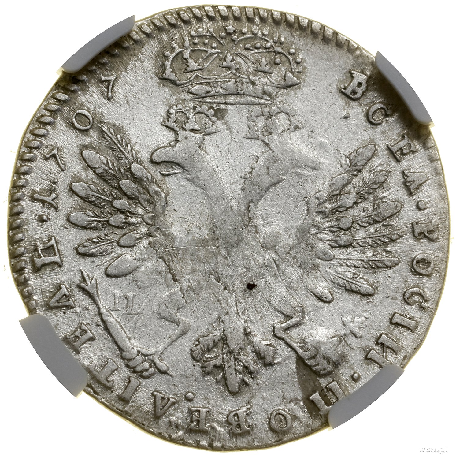 | 490 | ROSJA / Piotr I (1689–1725) Czech (tymf), 1707, Kadaszewski Dwor; Aw: Popiersie w prawo, ЦРЬ I В К ПЕТРЪ АЛЕѮIЕВИЧЪ; Rw: Dwugłowy Orzeł carski pod koroną, z lewej strony Orła litery IL, ВСЕА РОС.. |
