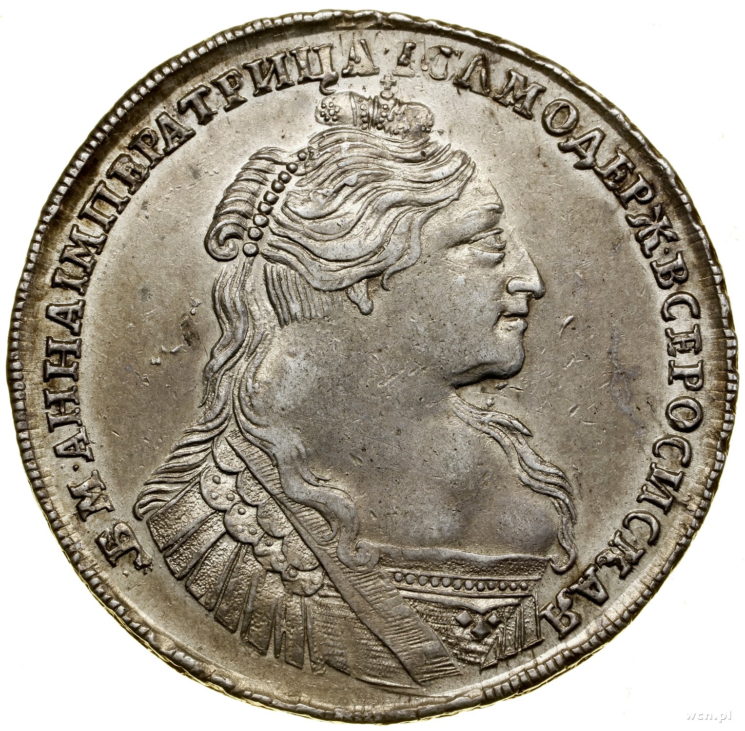 | 491 | ROSJA / Anna (1730–1740) Rubel, 1734, Kadaszewski Dwor (Moskwa); odmiana z dziewięcioma perełkami w klamrze do włosów; Bitkin 119 (R1), Diakov 3.2.46–55 (nie notuje takich stempli), Uzdenikow.. |