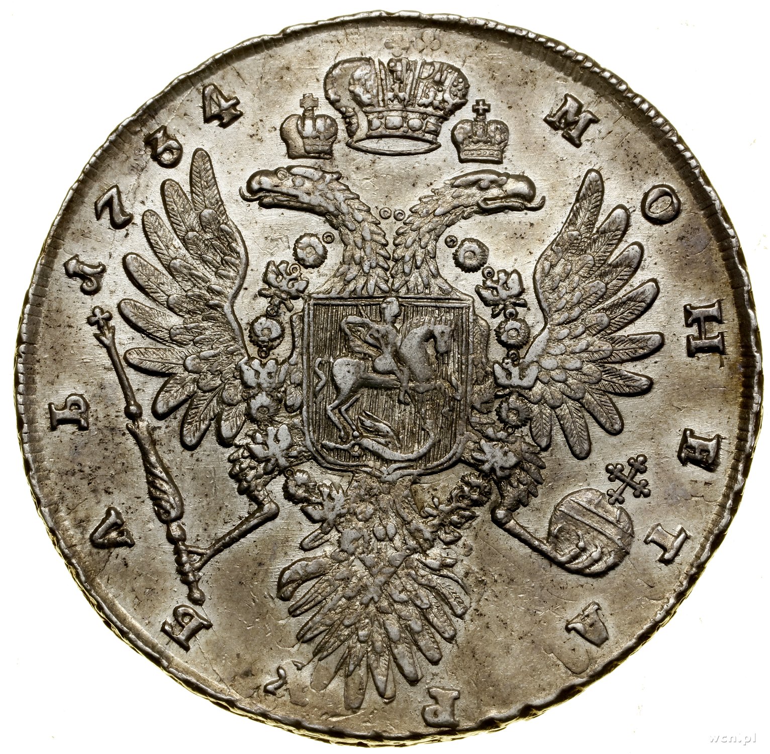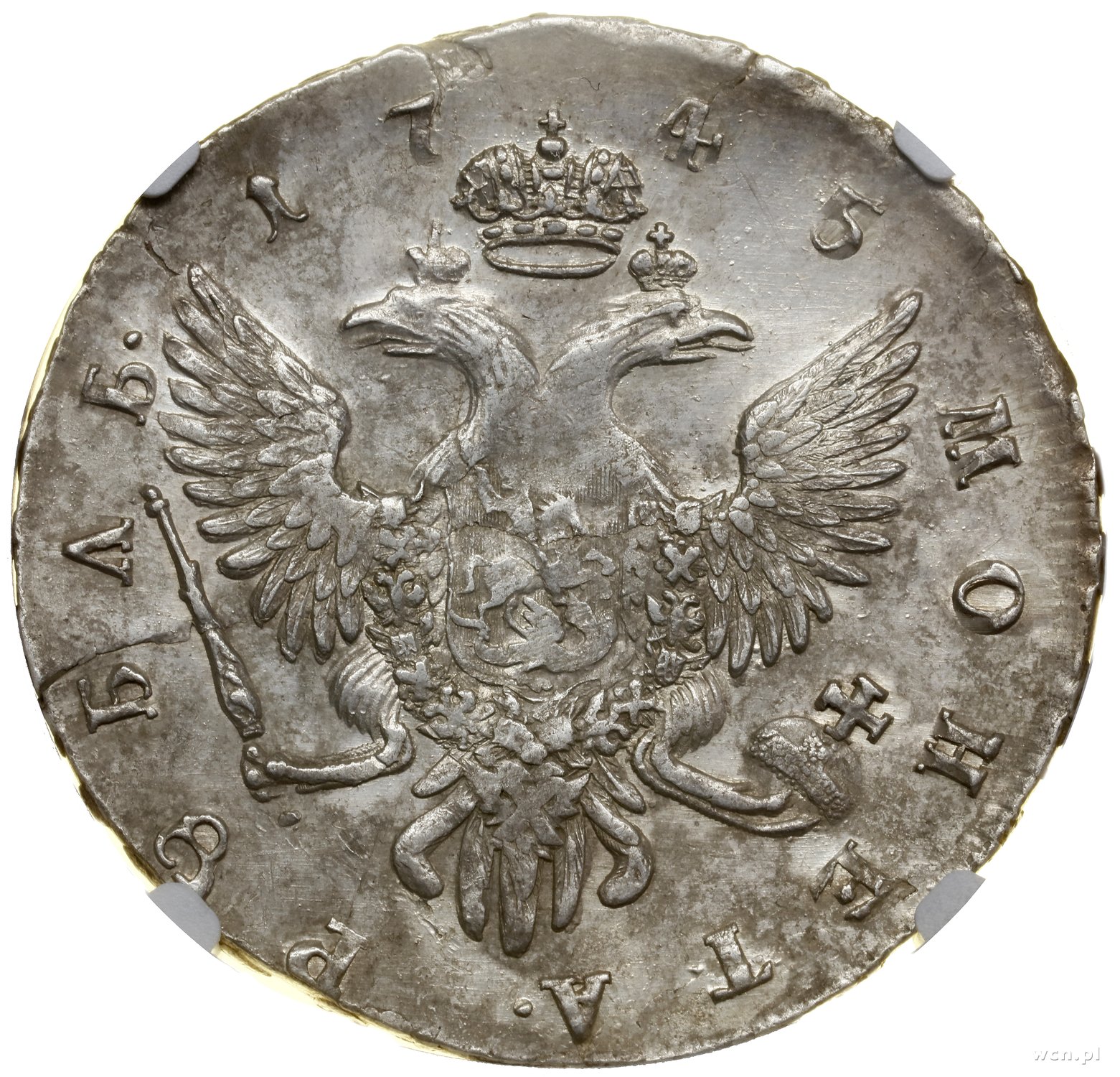 | 493 | ROSJA / Elżbieta (1741–1761) Rubel, 1745 СПБ, Petersburg; Bitkin 259, Diakov 129, Uzdenikow 0797; niewielkie pęknięcia krążka od strony rewersu, ale bardzo ładny egzemplarz z dużym blaskiem menni.. |