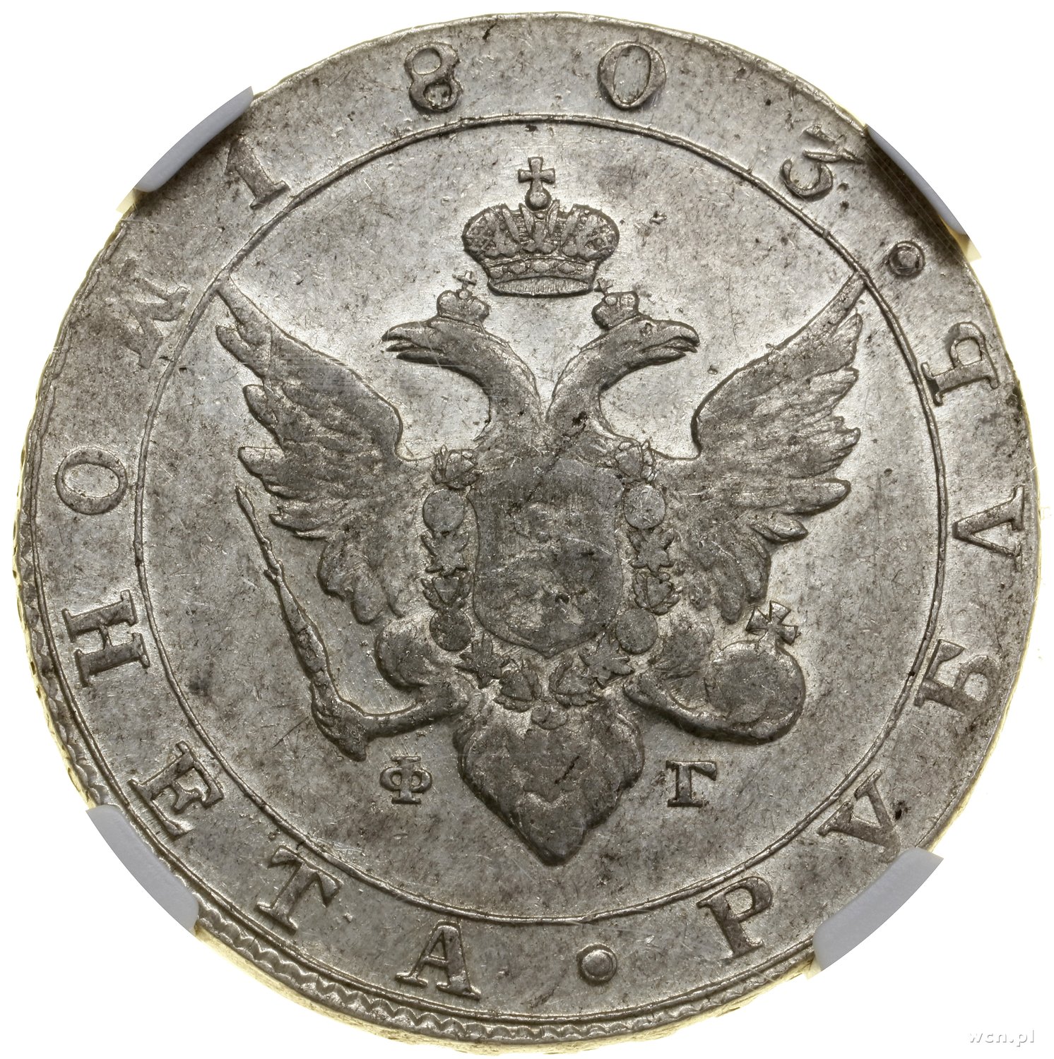 | 495 | ROSJA / Aleksander I (1801–1825) Rubel, 1803 СПБ-ФГ, Petersburg; rzadka odmiana z ФГ zamiast АИ; Adrianov 1803б, Bitkin 34 (R), Uzdenikow 1345; ładnie zachowana moneta w pudełku NGC 2923240-001 z oce.. |