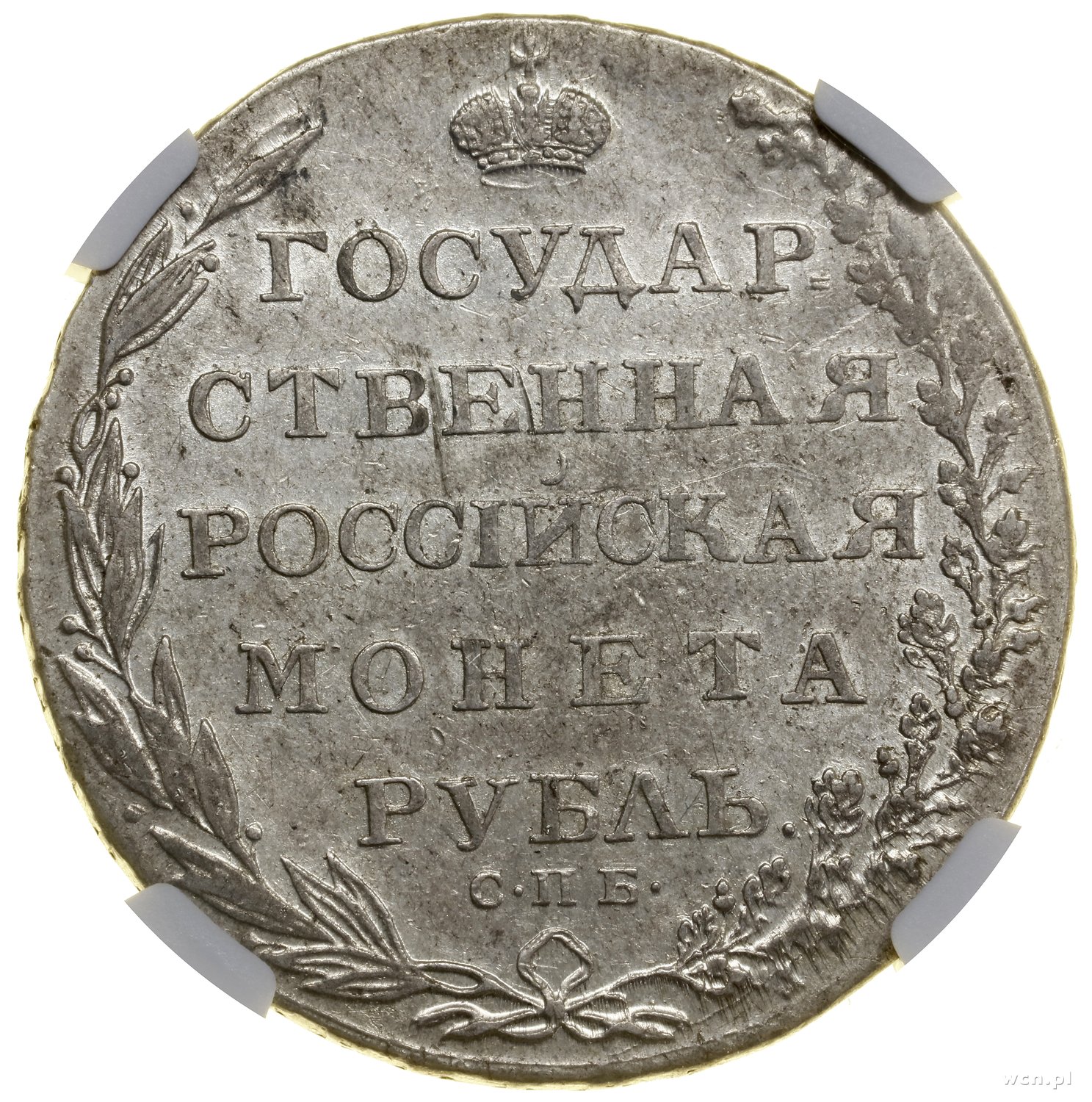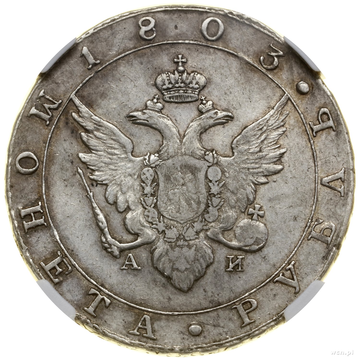 | 496 | ROSJA / Aleksander I (1801–1825) Rubel, 1803 СРБ-АИ, Petersburg; odmiana z inicjałami АИ; Adrianov 1803, Bitkin 33, Uzdenikow 1345; ładnie zachowana moneta w pudełku NGC z oceną AU DETAILS / CLEANED. |