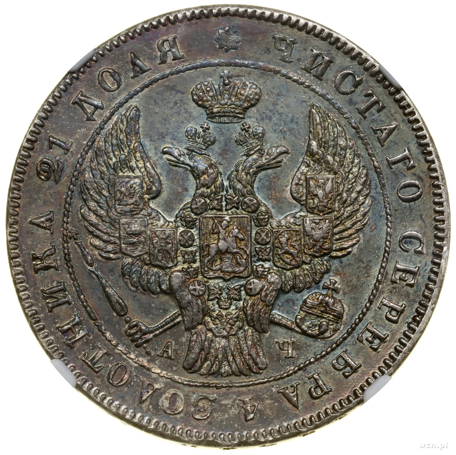 | 497 | ROSJA / Aleksander I (1801–1825) Rubel, 1842 СПБ-АЧ, Petersburg; odmiana z siedmioma gałązkami laurowymi w wieńcu, ogon Orła bez wystającego pióra; Adrianov 1842а, Bitkin 185, Uzdenikow 1604; kolorow.. |