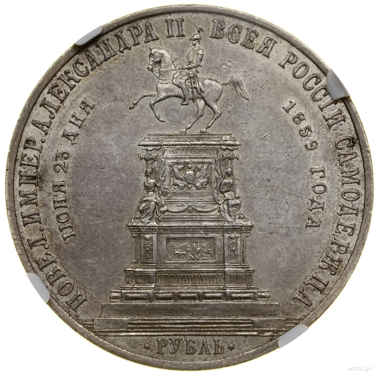 | 498 | ROSJA / Aleksander II (1855–1881) Rubel pomnikowy, 1859, Petersburg; wybity z okazji odsłonięcia pomnika Mikołaja I w Petersburgu 25 czerwca 1859 roku, w rocznicę urodzin zmarłego cara Mikołaja I; Bit.. |