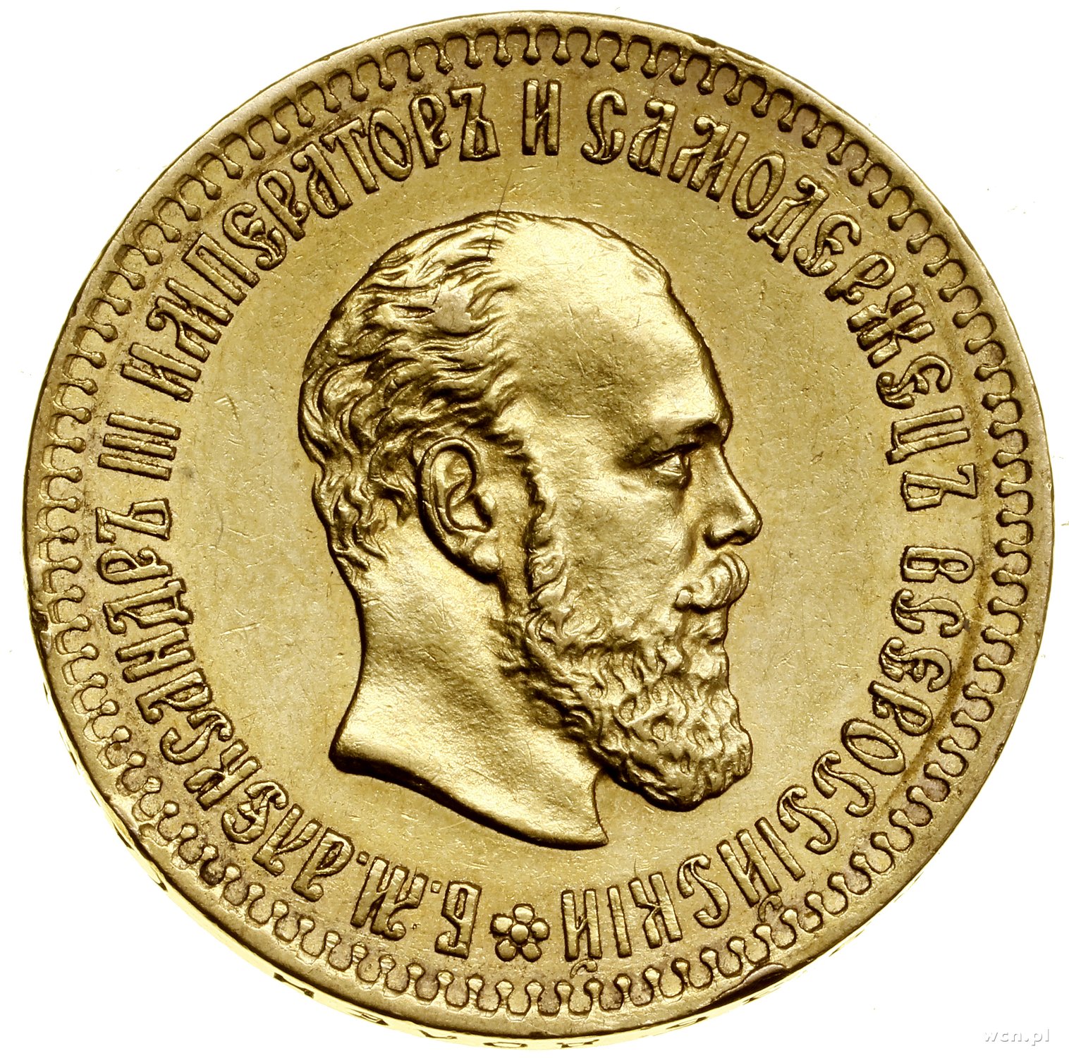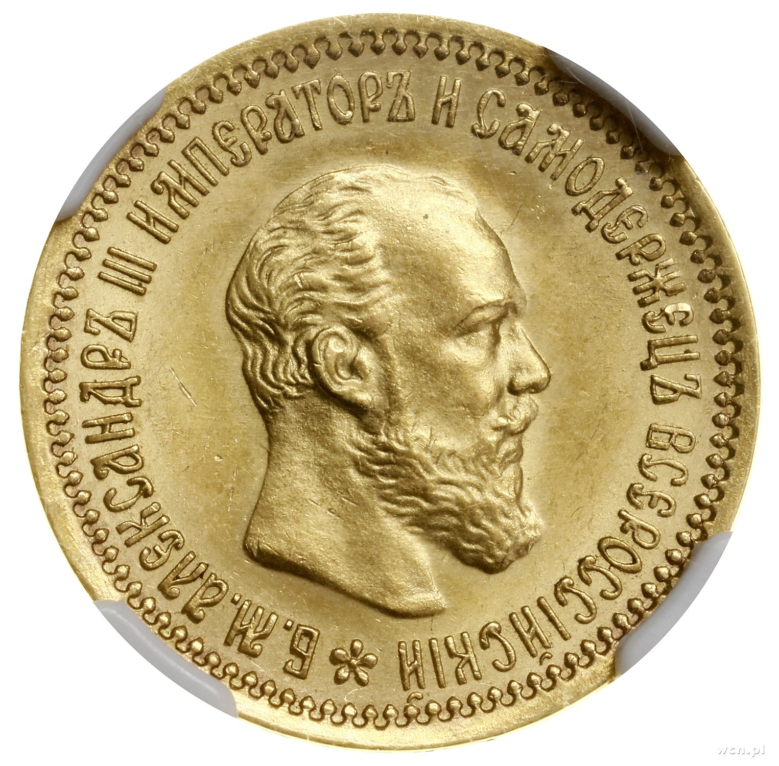 | 500 | ROSJA / Aleksander III (1881–1894) 5 rubli, 1890 (А•Г), Petersburg; Bitkin 35, Fr. 168, Kazakov 721, Uzdenikow 0304; złoto; pięknie zachowana moneta w pudełku NGC 3312727-006 z oceną MS64. |
