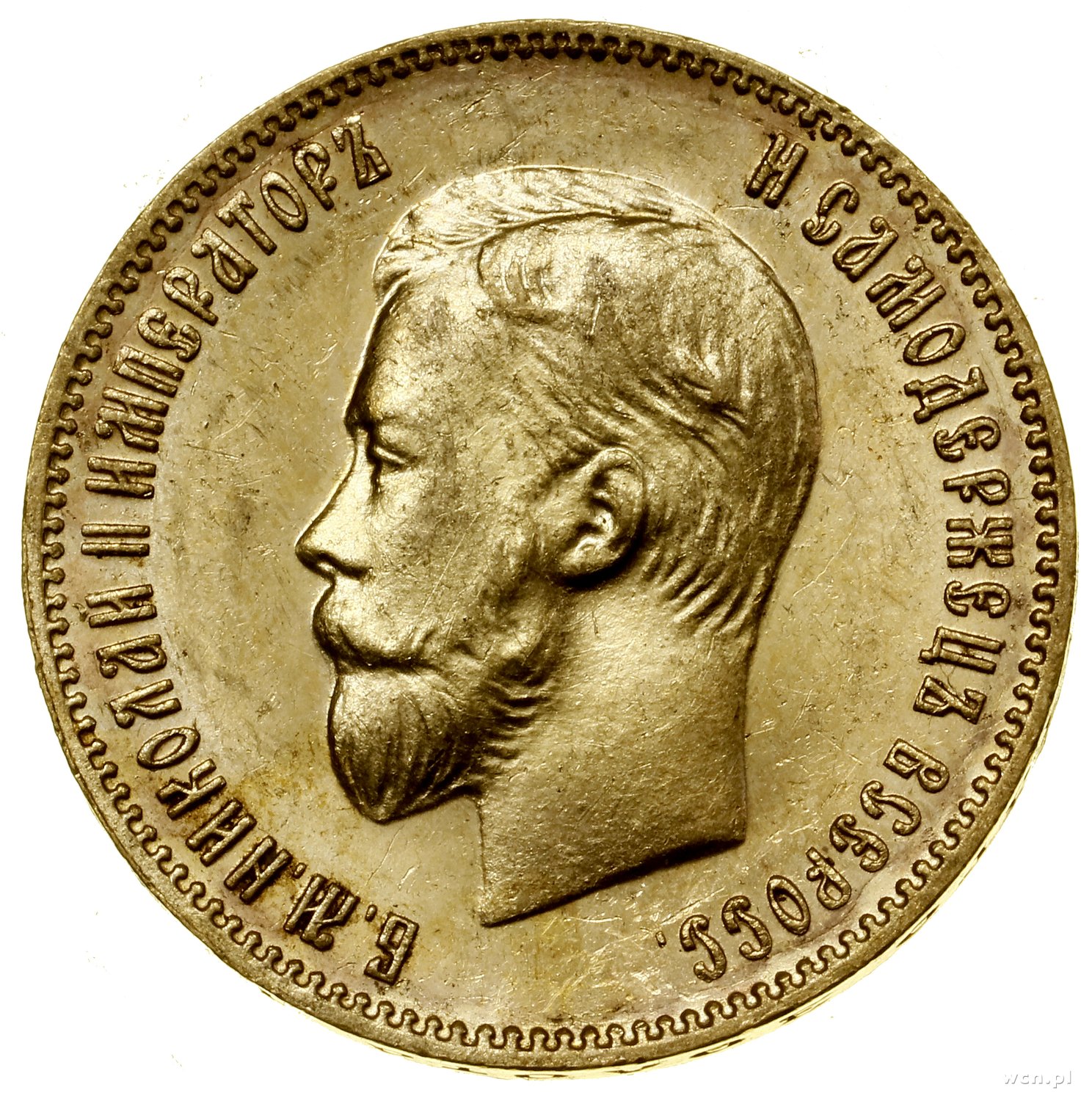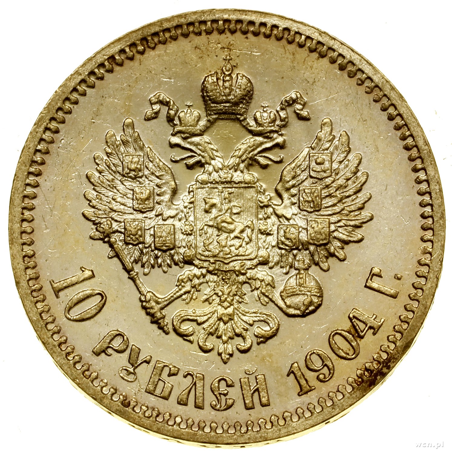 | 501 | ROSJA / Mikołaj II (1894–1917) 10 rubli, 1904 (A•P), Petersburg; Bitkin 12, Fr. 179, Kazakov 281, Сидоров 2041, Uzdenikow 0348; złoto, 8.60 g; pięknie zachowana moneta. |