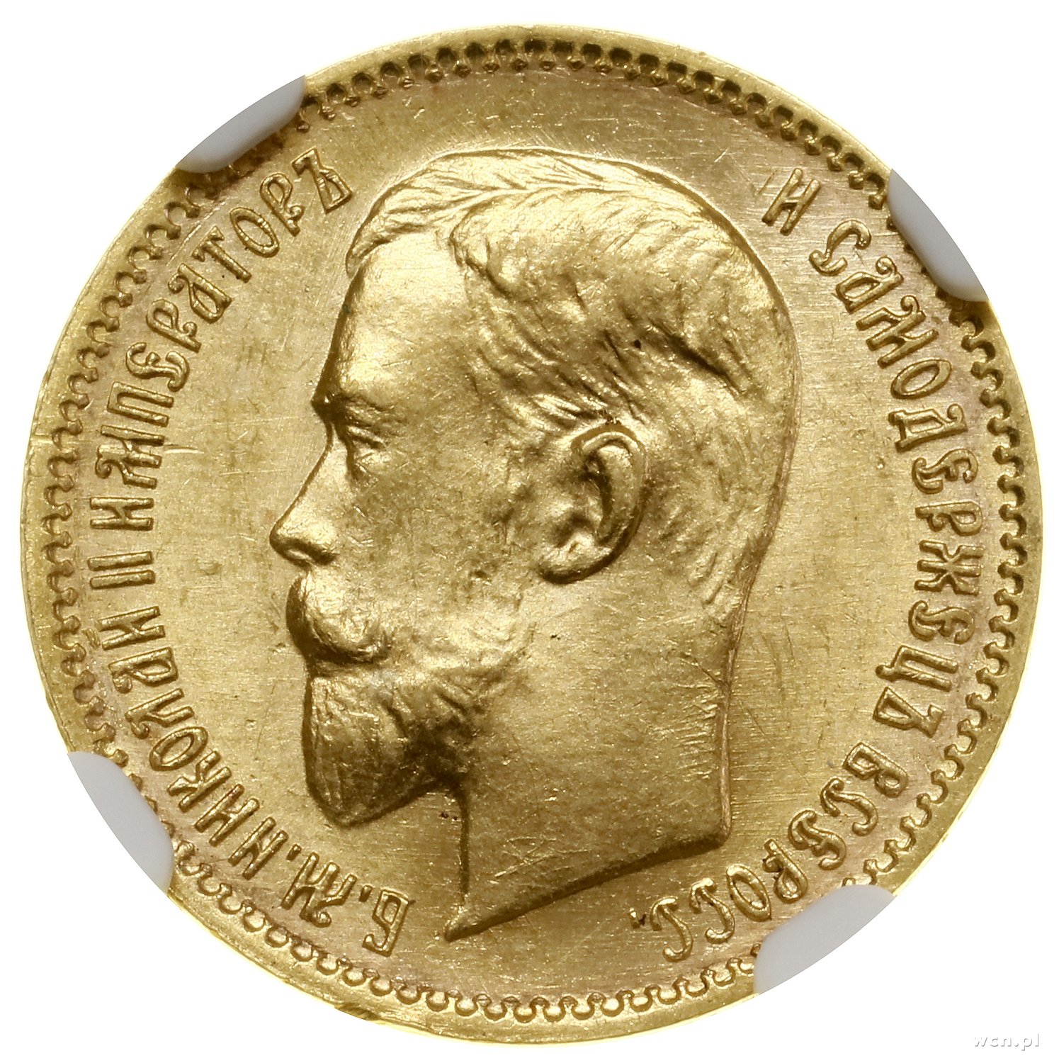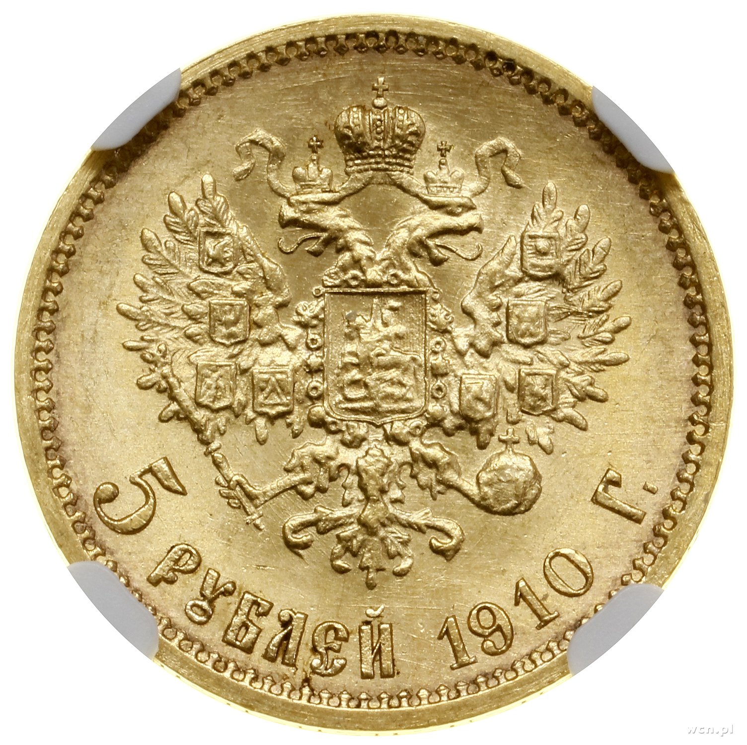 | 503 | ROSJA / Mikołaj II (1894–1917) 5 rubli, 1910, Petersburg; Bitkin 36 (R), Fr. 180, Kazakov 377, Сидоров 4101, Uzdenikow 0356; złoto; bardzo rzadki rocznik, pięknie zachowana moneta w pudełku NGC 836.. |