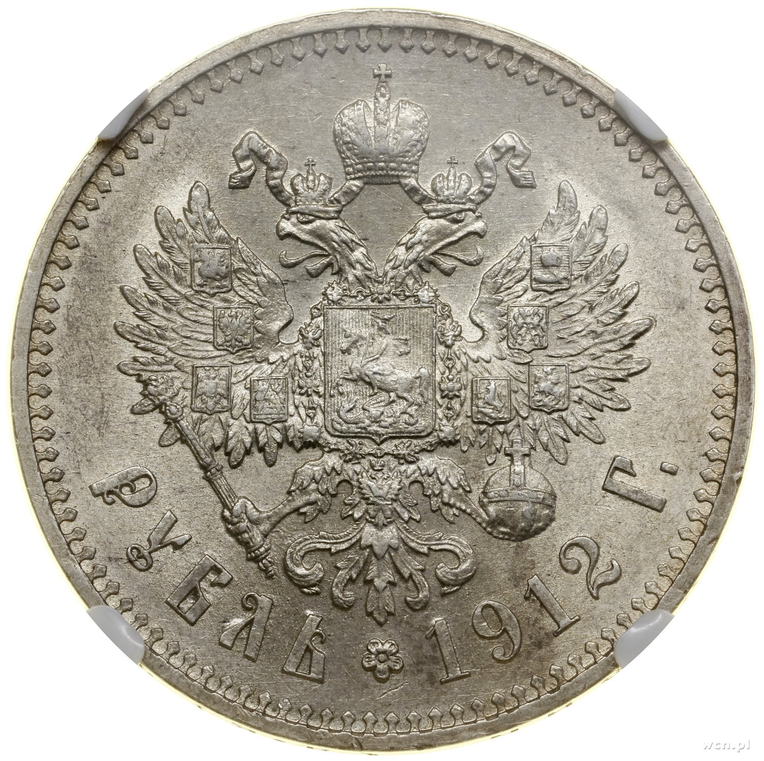 | 506 | ROSJA / Mikołaj II (1894–1917) Rubel, 1912 (Э•Б), Petersburg; Bitkin 66, Kazakov 416, Uzdenikow 2188; piękna moneta w pudełku NGC 3824737-007 z oceną MS62. |