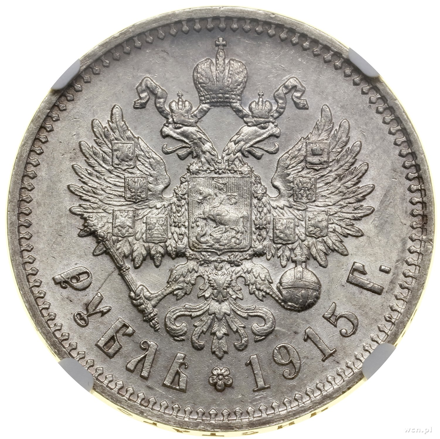 | 507 | ROSJA / Mikołaj II (1894–1917) Rubel, 1915 (B•C), Petersburg; Bitkin 70 (R), Kazakov 479, Uzdenikow 2214; rzadki rocznik w pięknym stanie zachowania, moneta w pudełku NGC 4200802-007 z oceną MS61. |
